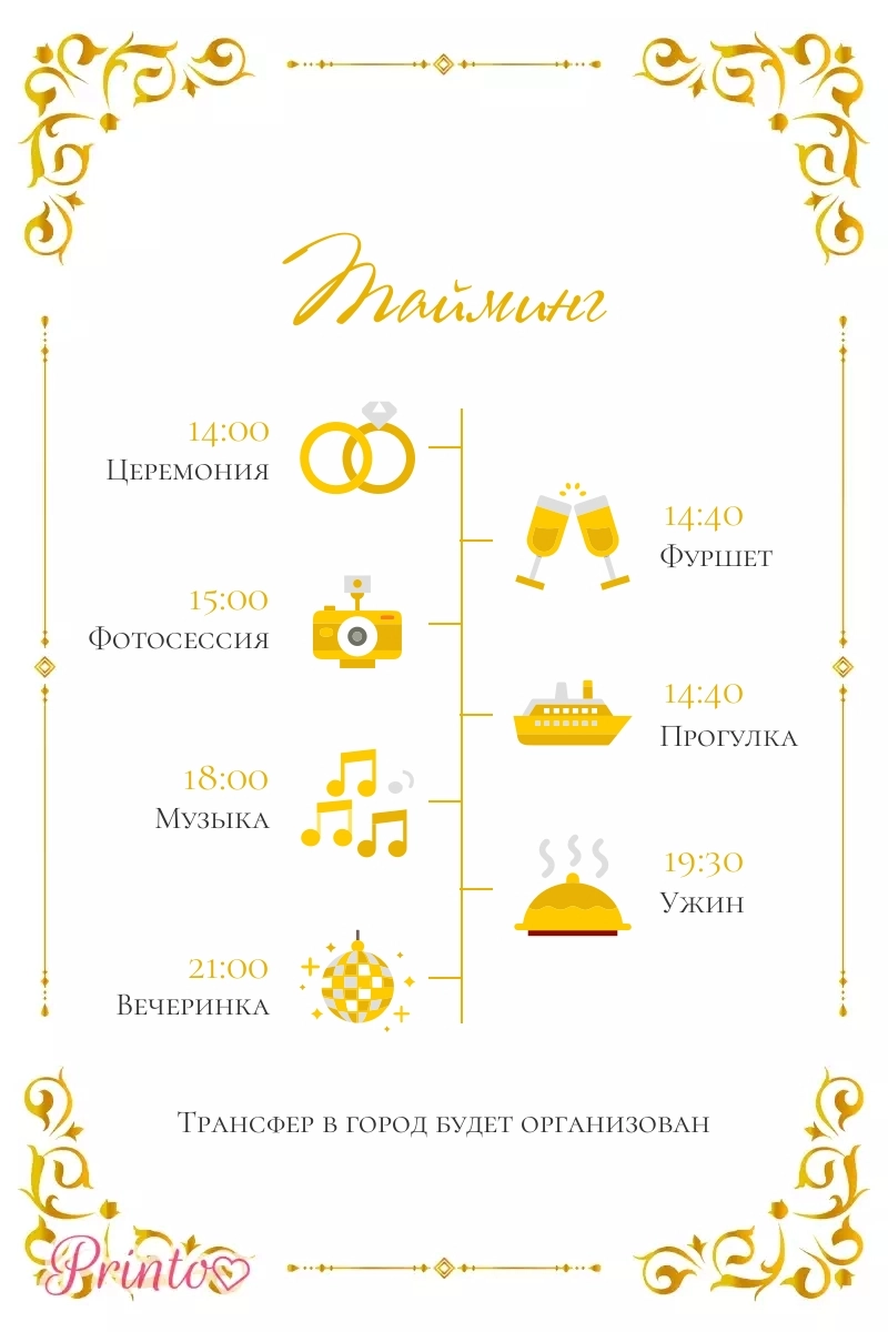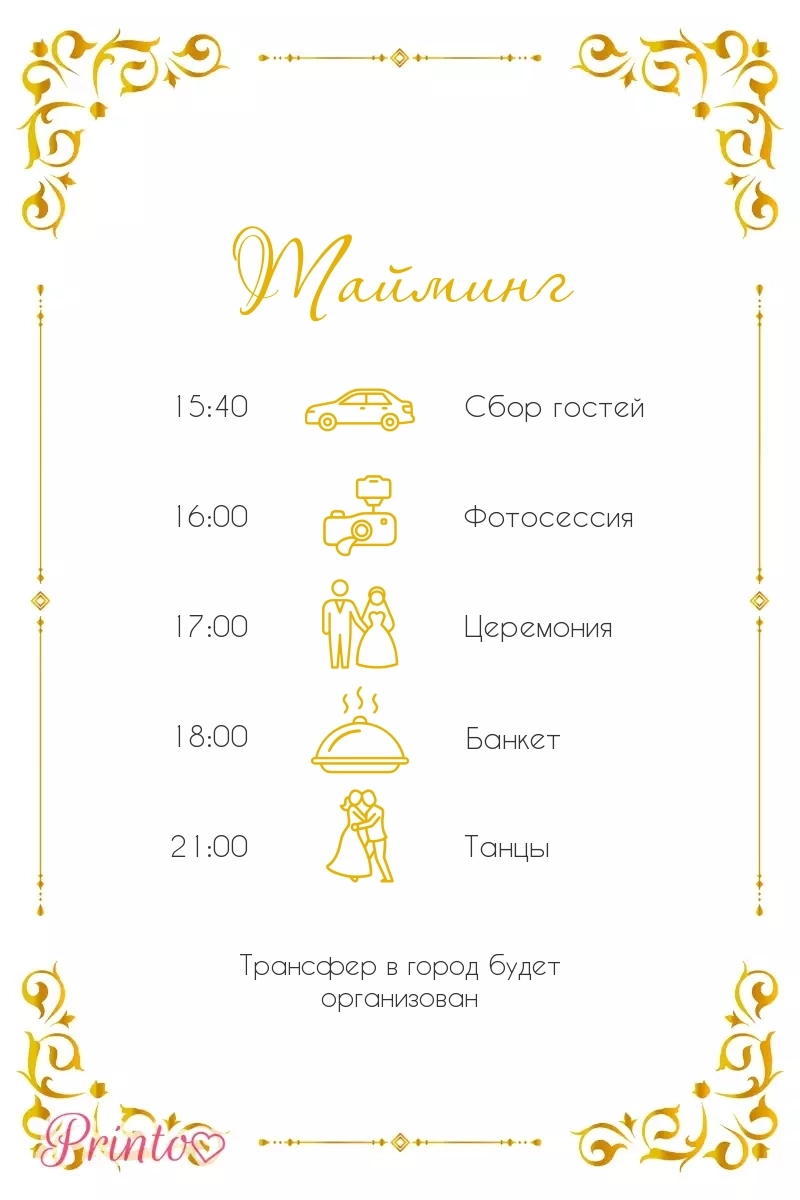 Расскажите гостям о программе свадьбы. Укажите время начала и окончания, а так же основные мероприятия.