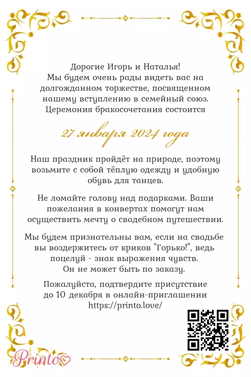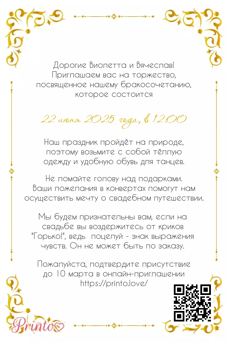 На листе может располагаться персональная ссылка, а так же QR-код на именное цифровое приглашение. Таким образом гости, получившие печатное приглашение, смогут узнать больше о свадьбе и подтвердить присутствие в онлайне.