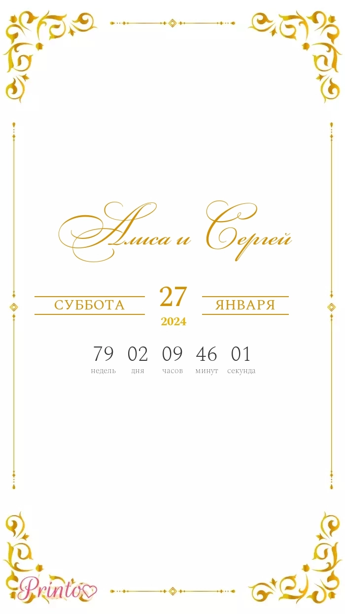 Разместите на нём имена жениха и невесты, дату, а так же обратный отсчёт до свадьбы.