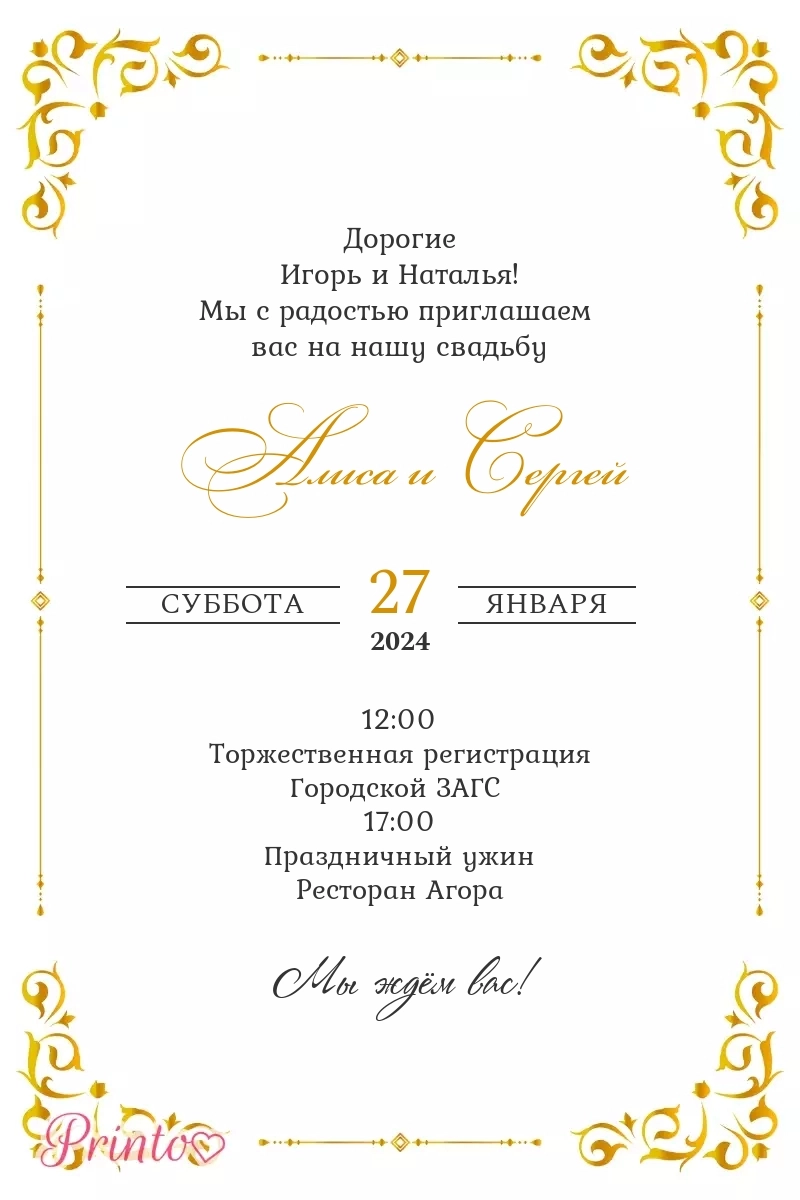 Печатное приглашение на свадьбу