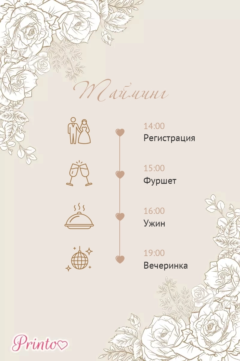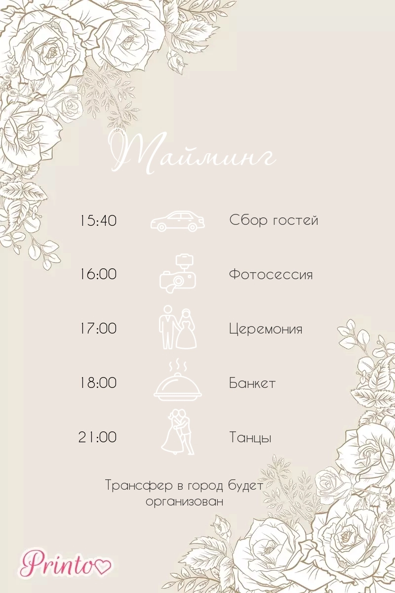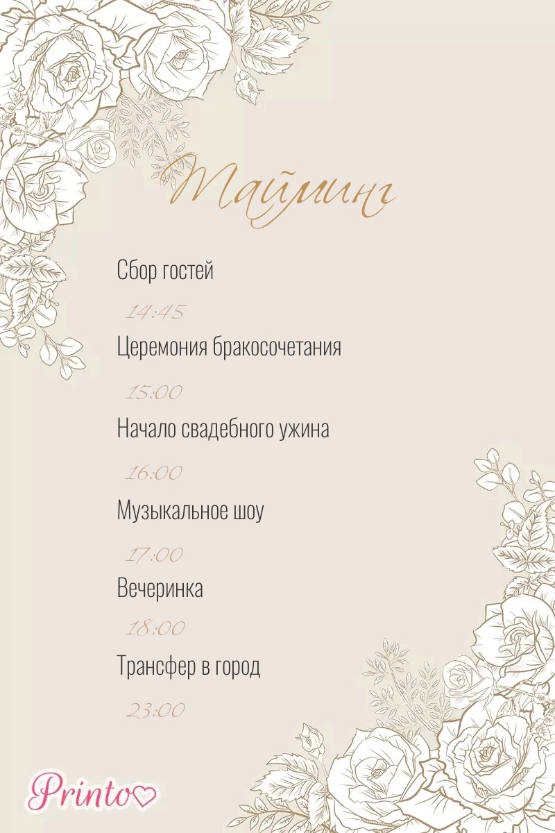 Расскажите гостям о программе свадьбы. Укажите время начала и окончания, а так же основные мероприятия.