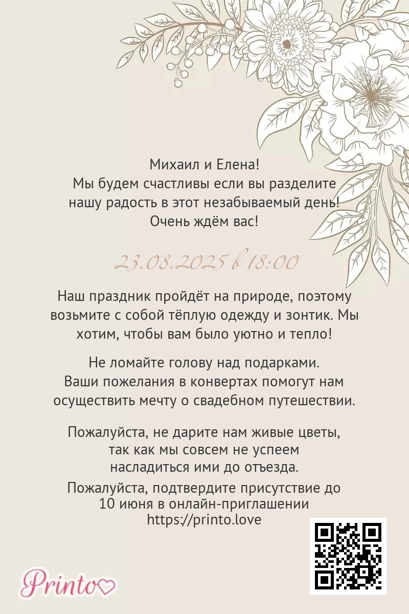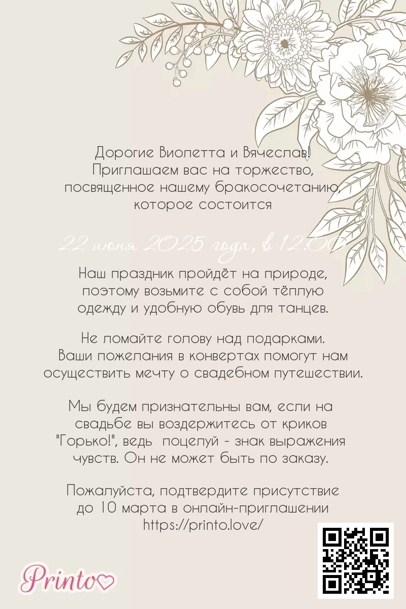 На листе может располагаться персональная ссылка, а так же QR-код на именное цифровое приглашение. Таким образом гости, получившие печатное приглашение, смогут узнать больше о свадьбе и подтвердить присутствие в онлайне.