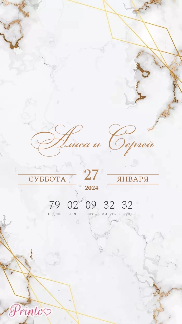 Разместите на нём имена жениха и невесты, дату, а так же обратный отсчёт до свадьбы.