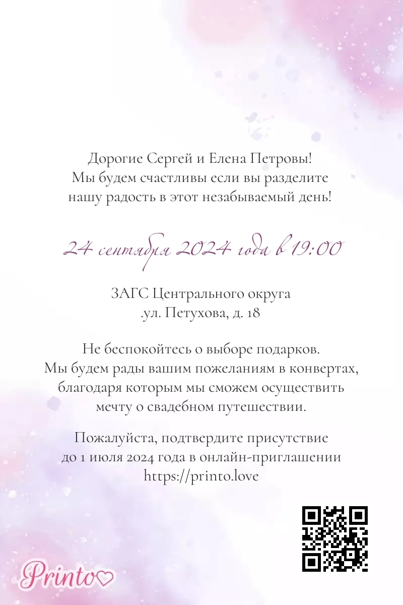 На листе может располагаться персональная ссылка, а так же QR-код на именное цифровое приглашение. Таким образом гости, получившие печатное приглашение, смогут узнать больше о свадьбе и подтвердить присутствие в онлайне.