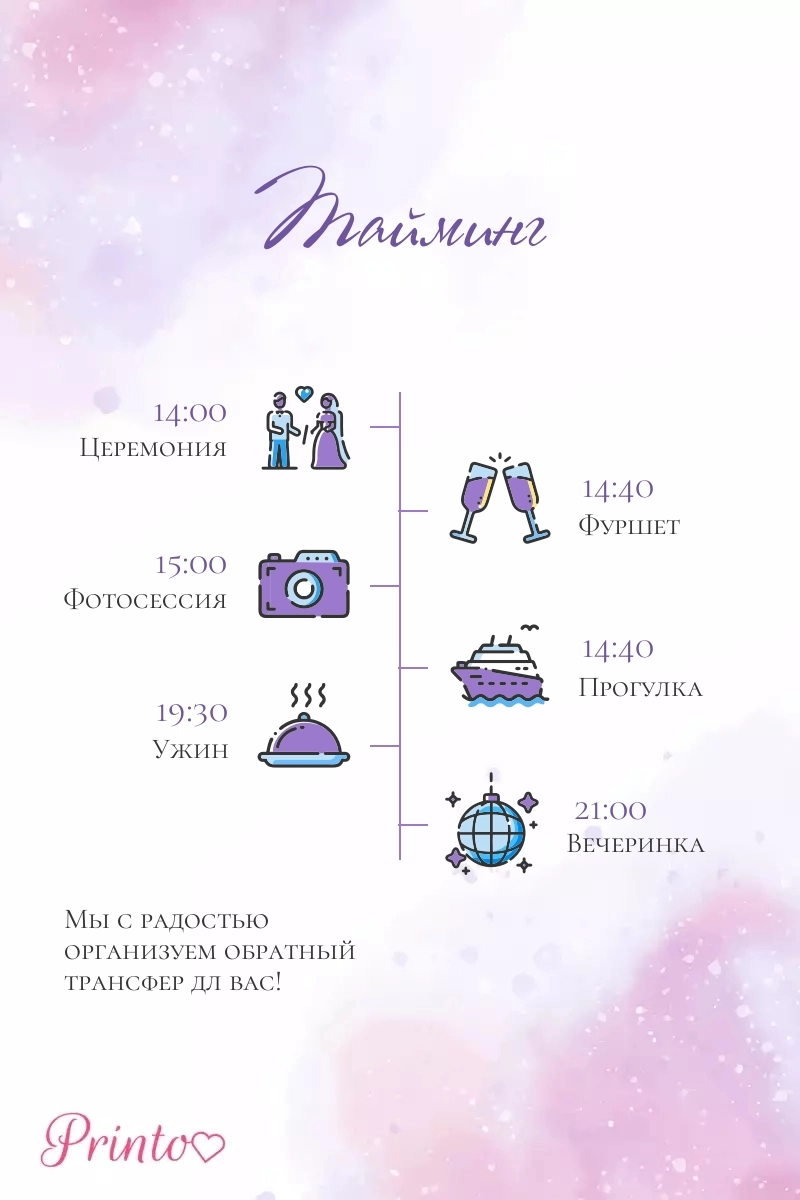 Расскажите гостям о программе свадьбы. Укажите время начала и окончания, а так же основные мероприятия.