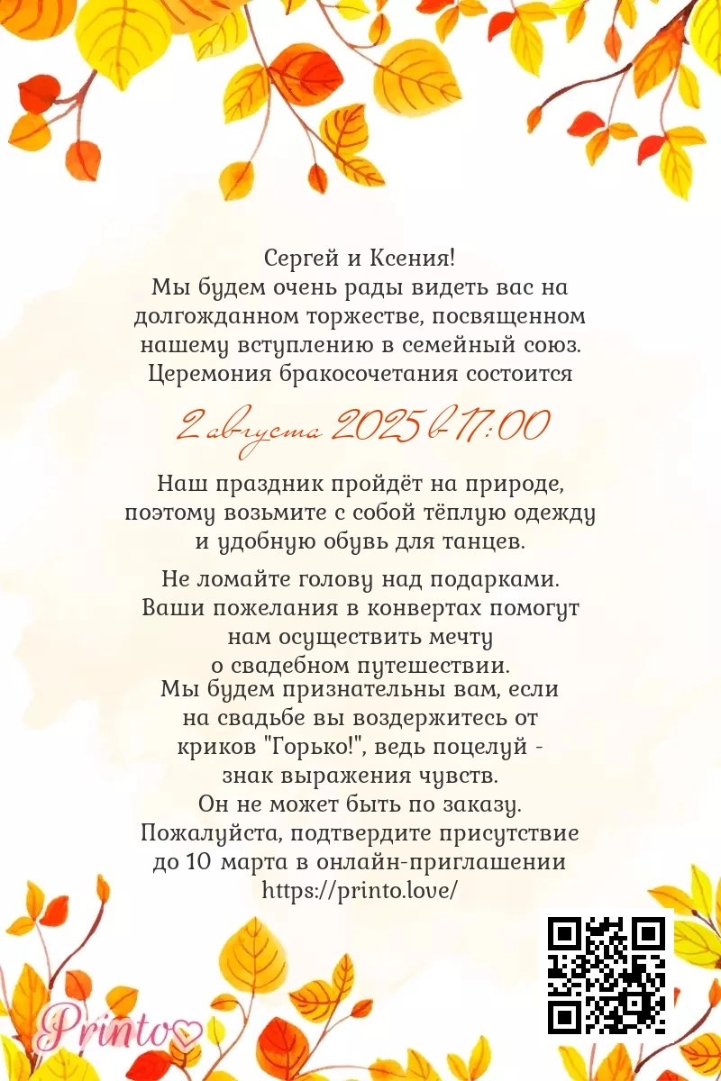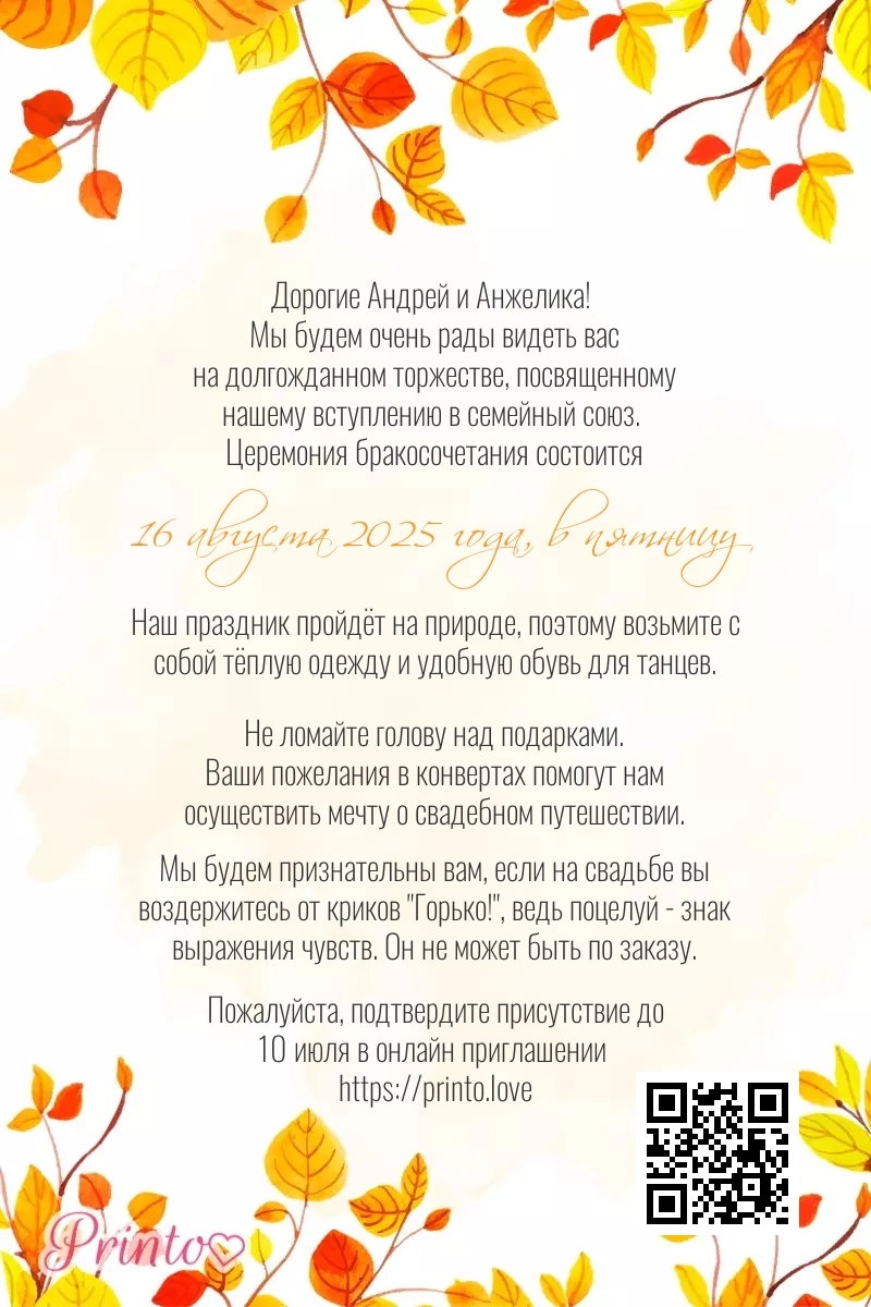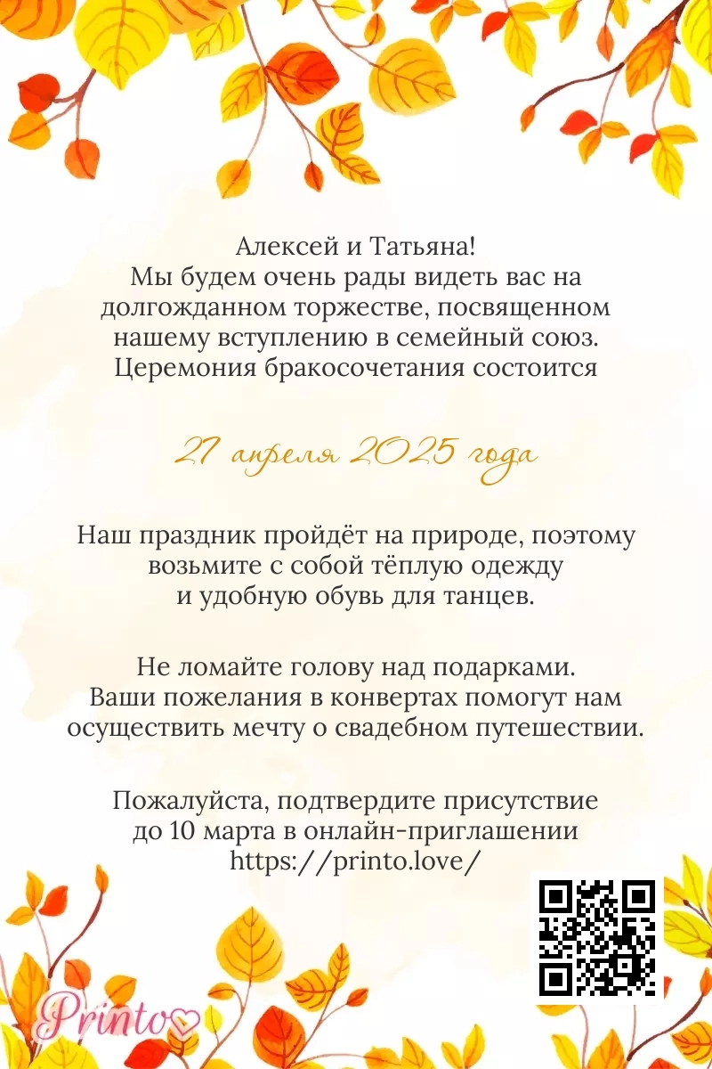 На листе может располагаться персональная ссылка, а так же QR-код на именное цифровое приглашение. Таким образом гости, получившие печатное приглашение, смогут узнать больше о свадьбе и подтвердить присутствие в онлайне.