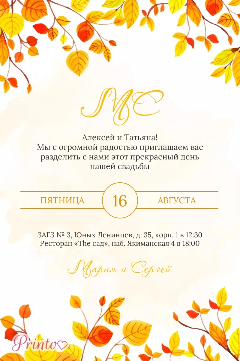 Печатное приглашение на свадьбу