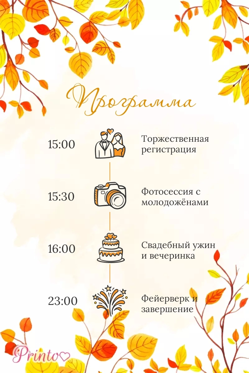Расскажите гостям о программе свадьбы. Укажите время начала и окончания, а так же основные мероприятия.