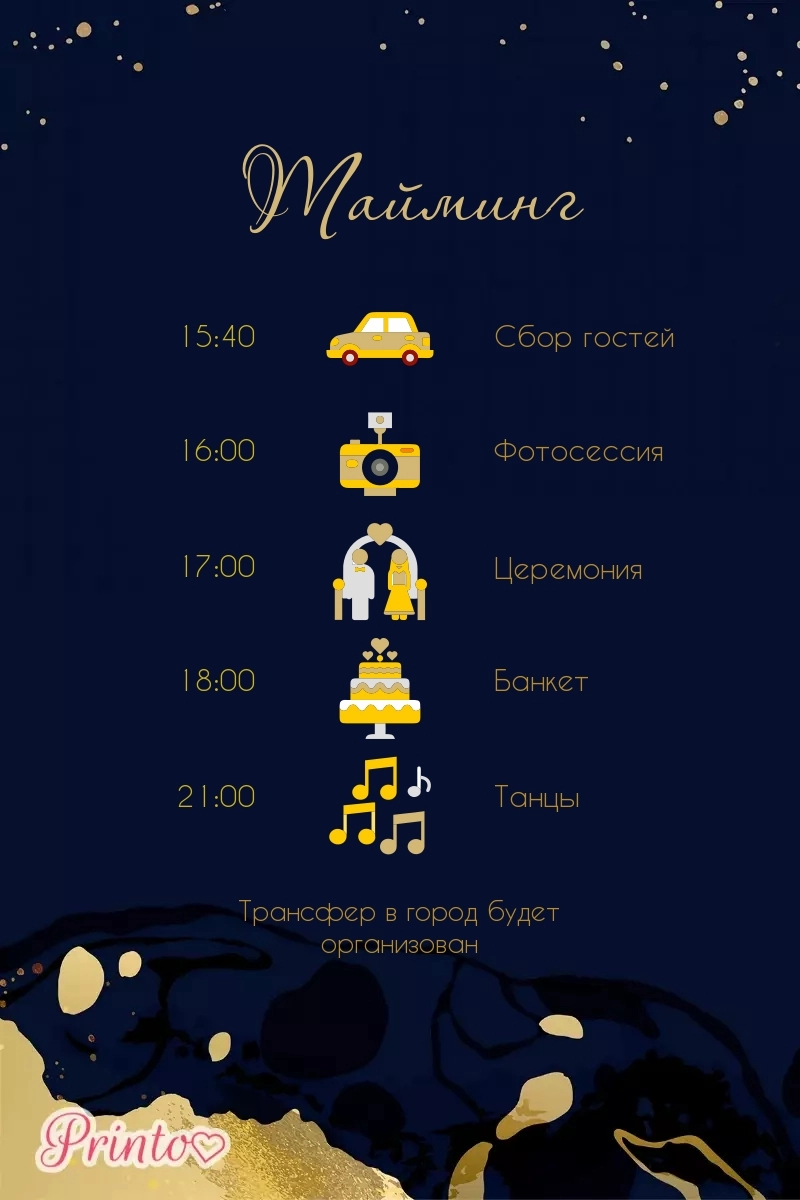 Расскажите гостям о программе свадьбы. Укажите время начала и окончания, а так же основные мероприятия.