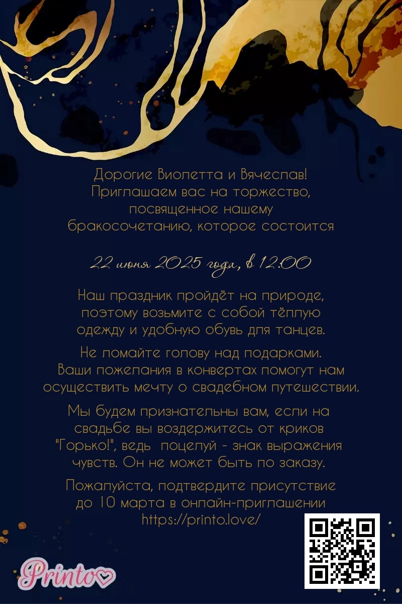 На листе может располагаться персональная ссылка, а так же QR-код на именное цифровое приглашение. Таким образом гости, получившие печатное приглашение, смогут узнать больше о свадьбе и подтвердить присутствие в онлайне.
