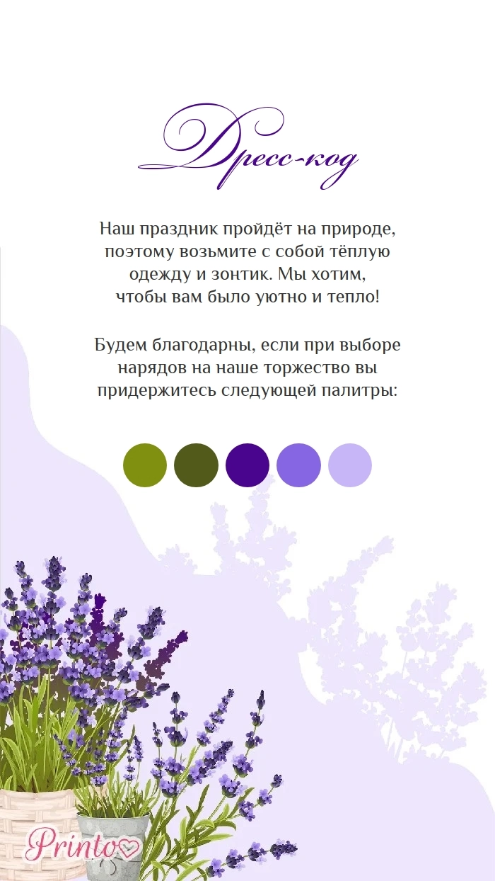 Укажите, какой дресс-код предпочтителен на вашей свадьбе. Если праздник будет проходить на природе, обязательно укажите, какую одежду и обувь лучше надеть.