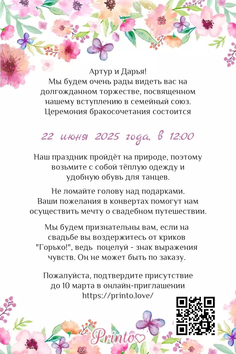 На листе может располагаться персональная ссылка, а так же QR-код на именное цифровое приглашение. Таким образом гости, получившие печатное приглашение, смогут узнать больше о свадьбе и подтвердить присутствие в онлайне.