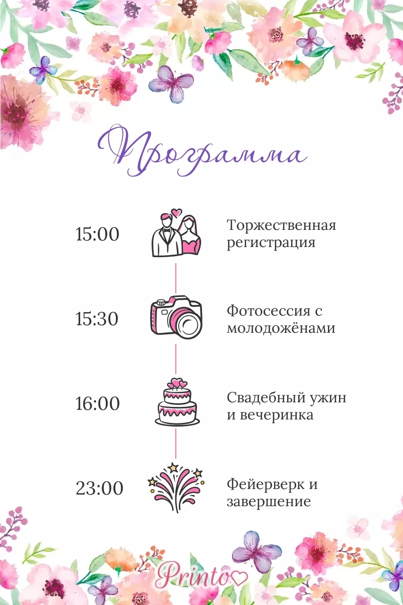 Расскажите гостям о программе свадьбы. Укажите время начала и окончания, а так же основные мероприятия.