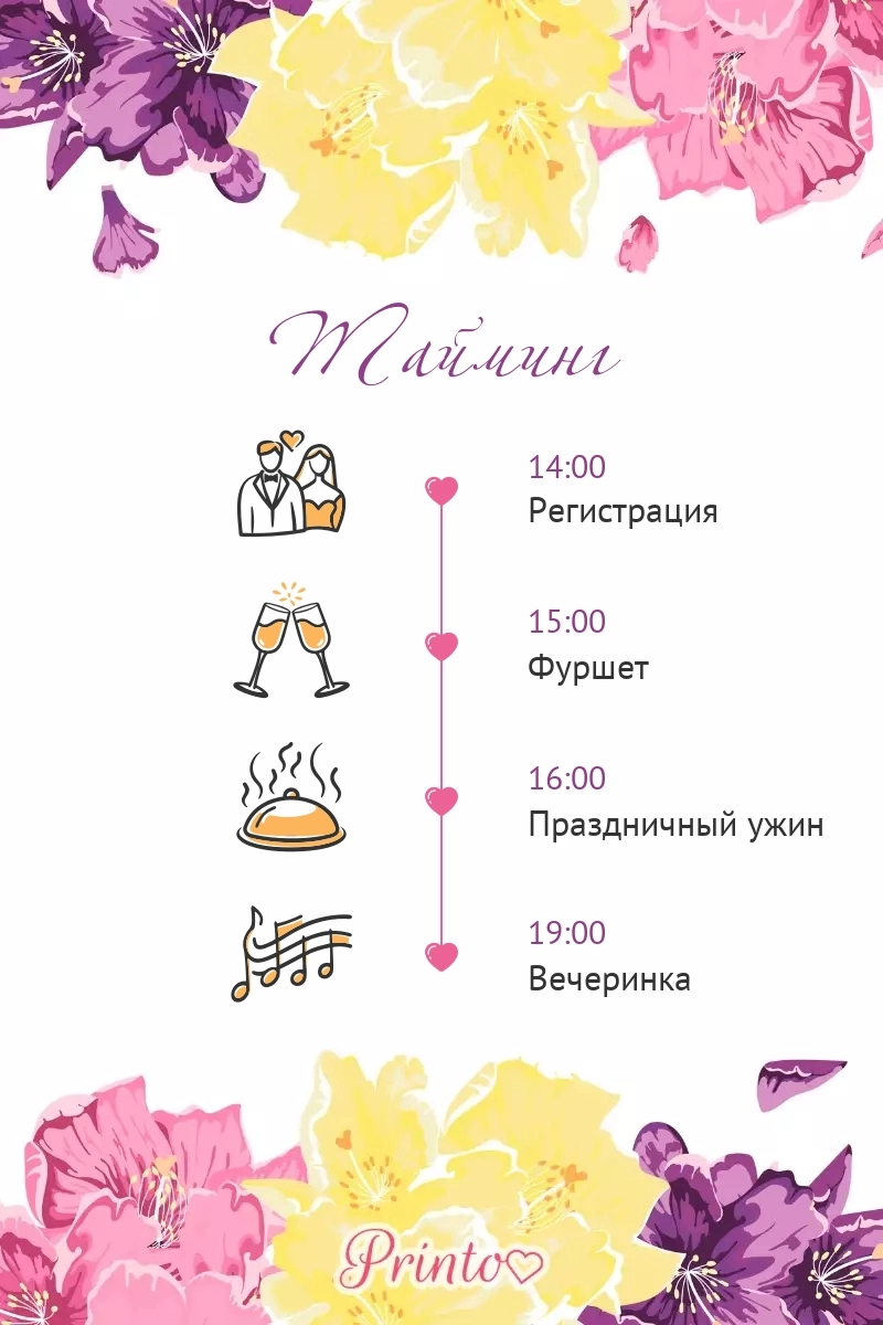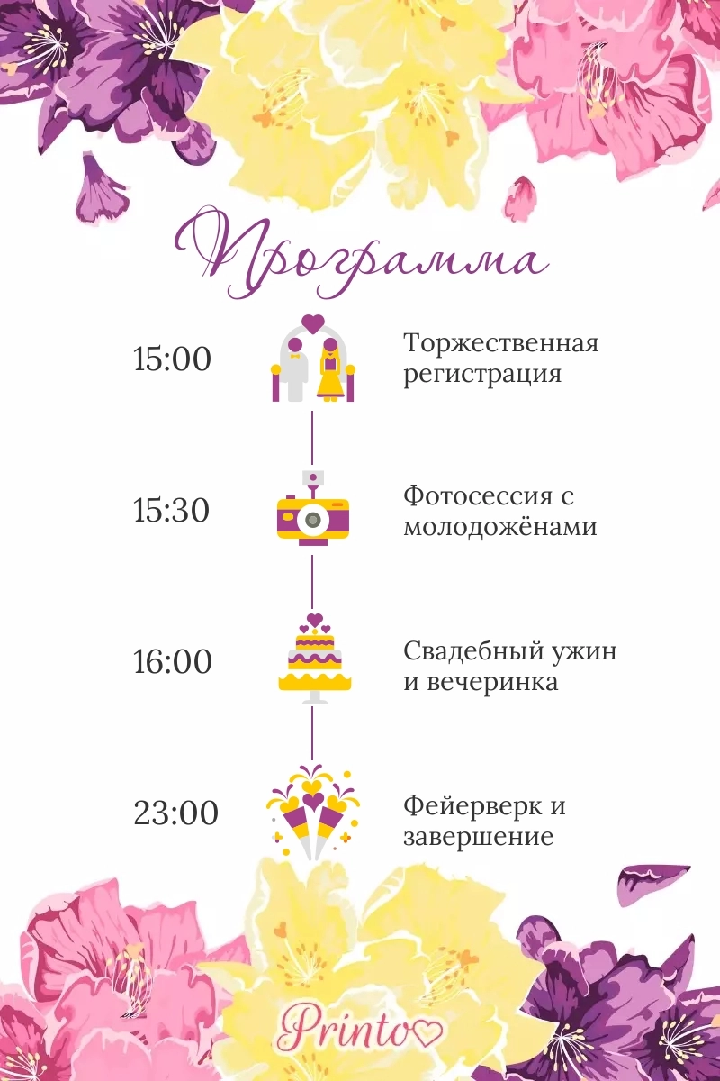 Расскажите гостям о программе свадьбы. Укажите время начала и окончания, а так же основные мероприятия.