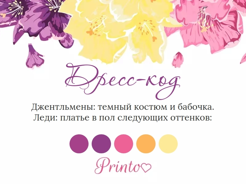 Укажите, какой дресс-код предпочтителен на вашей свадьбе. Вставьте на слайд палитру цветов, которые будут преобладать на свадьбе.