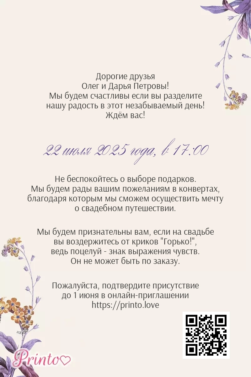 На листе может располагаться персональная ссылка, а так же QR-код на именное цифровое приглашение. Таким образом гости, получившие печатное приглашение, смогут узнать больше о свадьбе и подтвердить присутствие в онлайне.