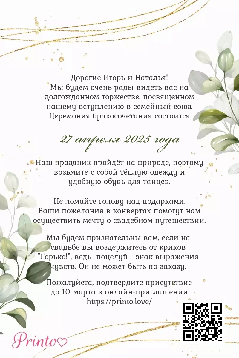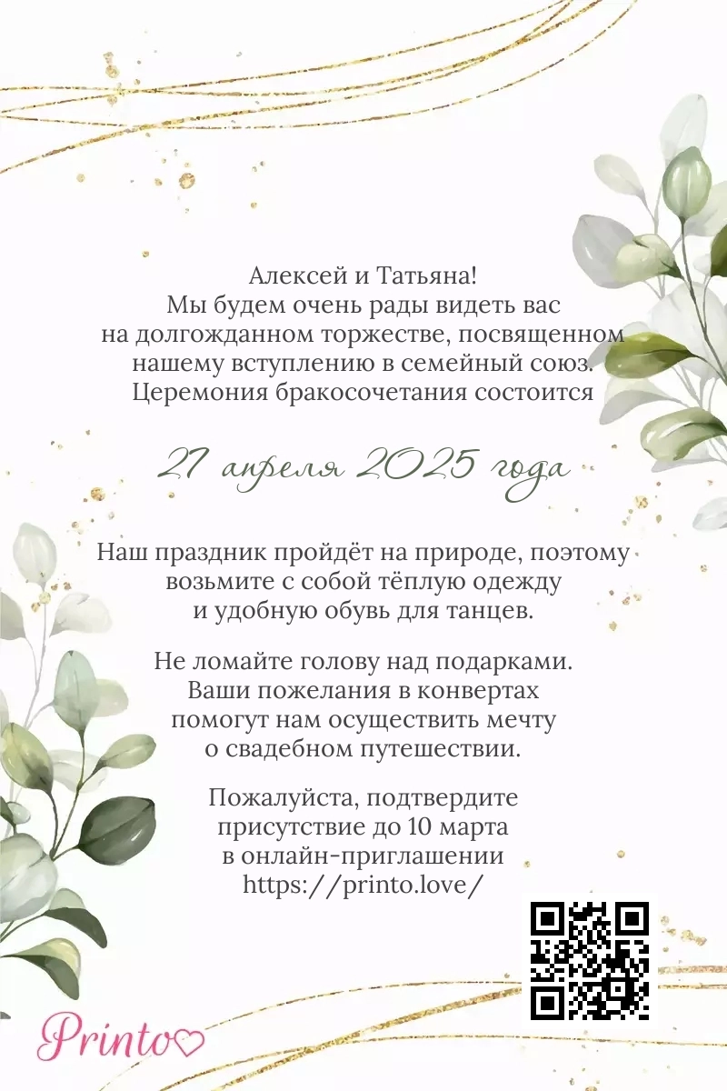 На листе может располагаться персональная ссылка, а так же QR-код на именное цифровое приглашение. Таким образом гости, получившие печатное приглашение, смогут узнать больше о свадьбе и подтвердить присутствие в онлайне.