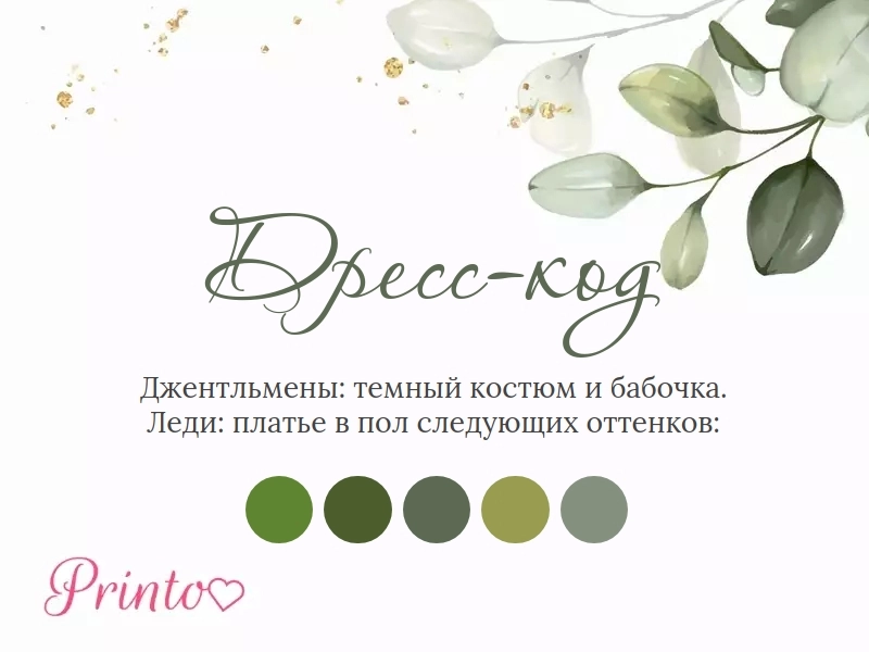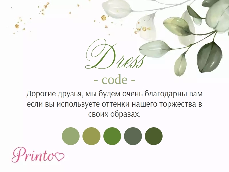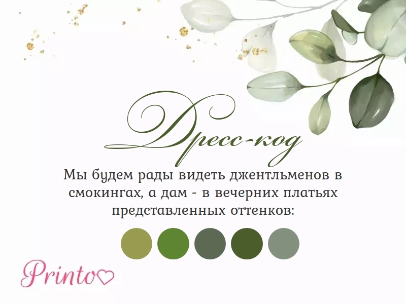 Укажите, какой дресс-код предпочтителен на вашей свадьбе. Вставьте на слайд палитру цветов, которые будут преобладать на свадьбе.