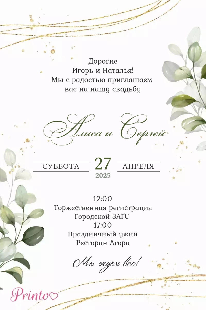 Именное приглашение для гостей - на каждое приглашение будет автоматически подставлено имена и обращение к гостям.