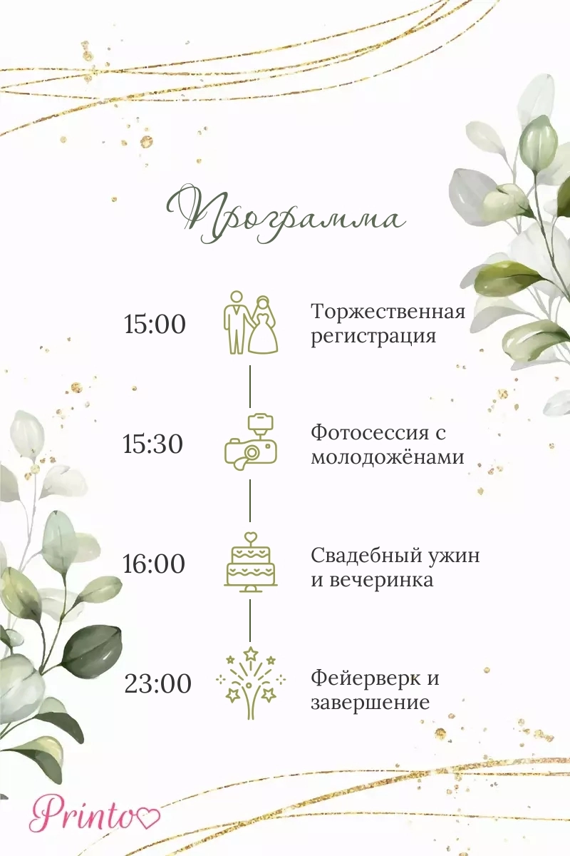 Расскажите гостям о программе свадьбы. Укажите время начала и окончания, а так же основные мероприятия.