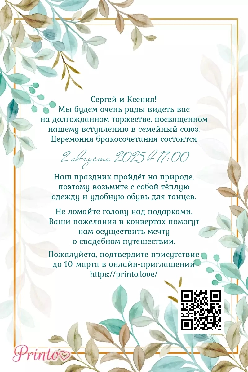 На листе может располагаться персональная ссылка, а так же QR-код на именное цифровое приглашение. Таким образом гости, получившие печатное приглашение, смогут узнать больше о свадьбе и подтвердить присутствие в онлайне.
