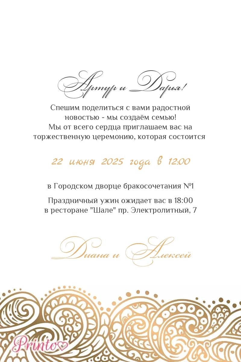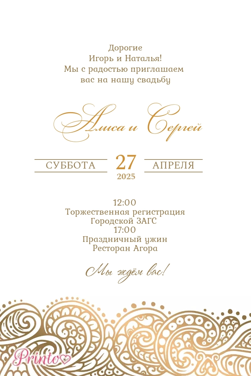 Именное приглашение для гостей - на каждое приглашение будет автоматически подставлено имена и обращение к гостям.