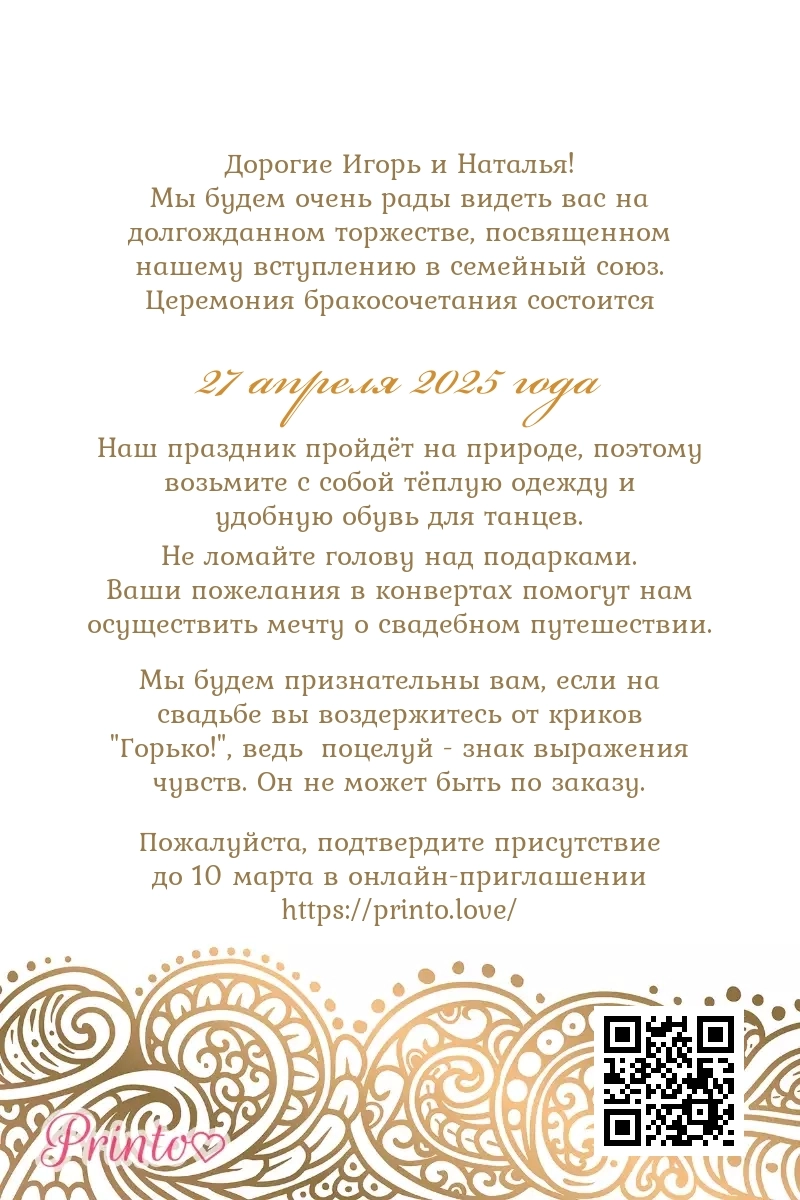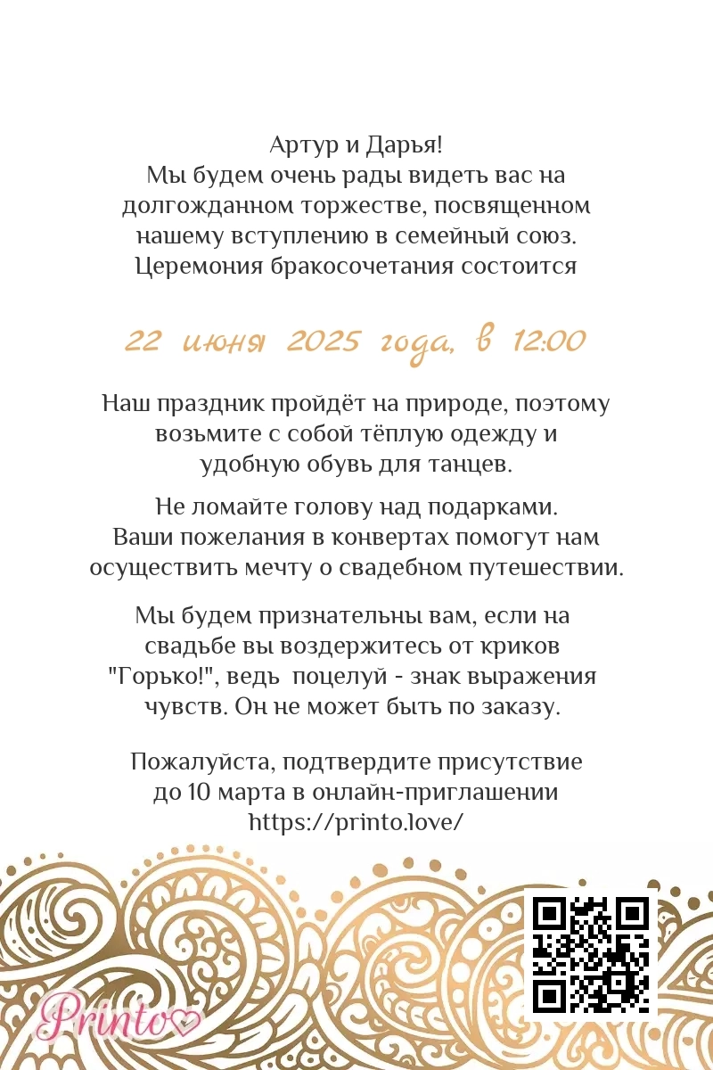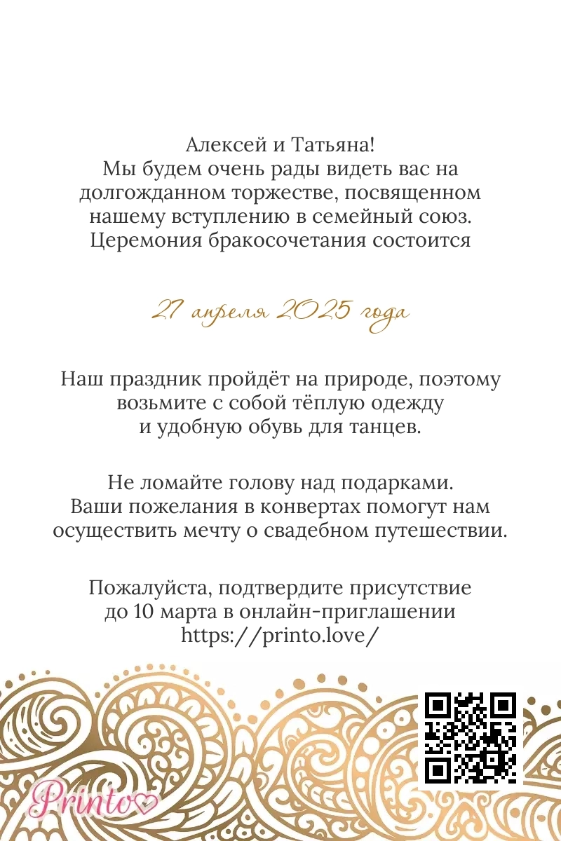 На листе может располагаться персональная ссылка, а так же QR-код на именное цифровое приглашение. Таким образом гости, получившие печатное приглашение, смогут узнать больше о свадьбе и подтвердить присутствие в онлайне.