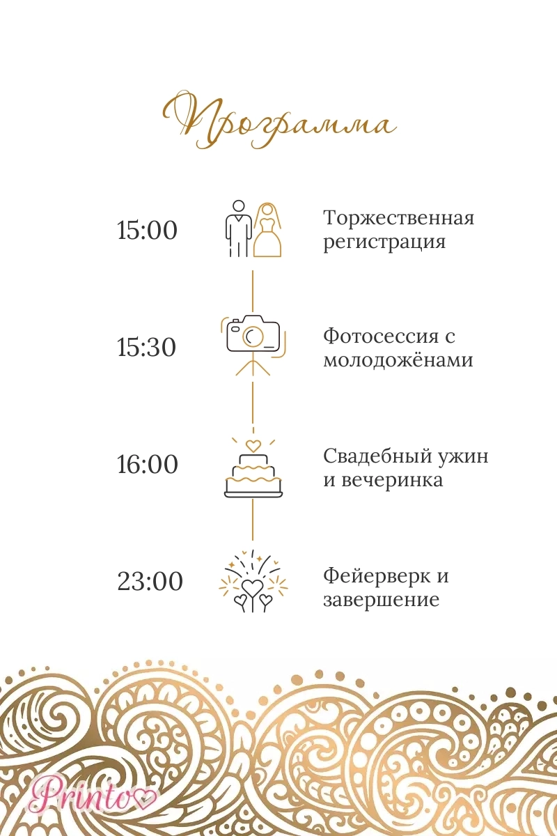 Расскажите гостям о программе свадьбы. Укажите время начала и окончания, а так же основные мероприятия.