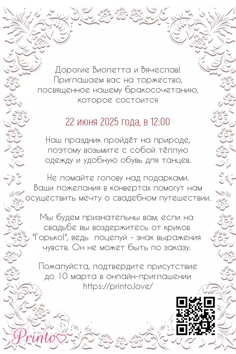 На листе может располагаться персональная ссылка, а так же QR-код на именное цифровое приглашение. Таким образом гости, получившие печатное приглашение, смогут узнать больше о свадьбе и подтвердить присутствие в онлайне.