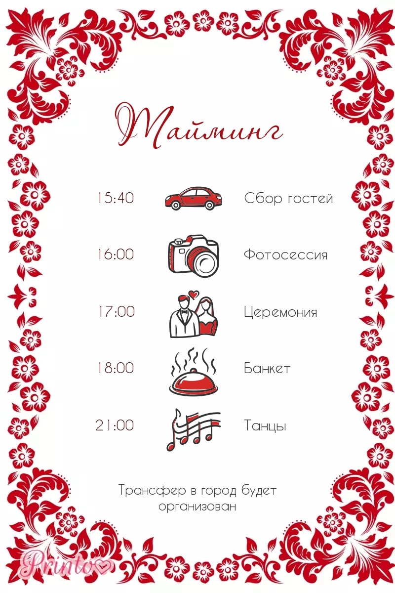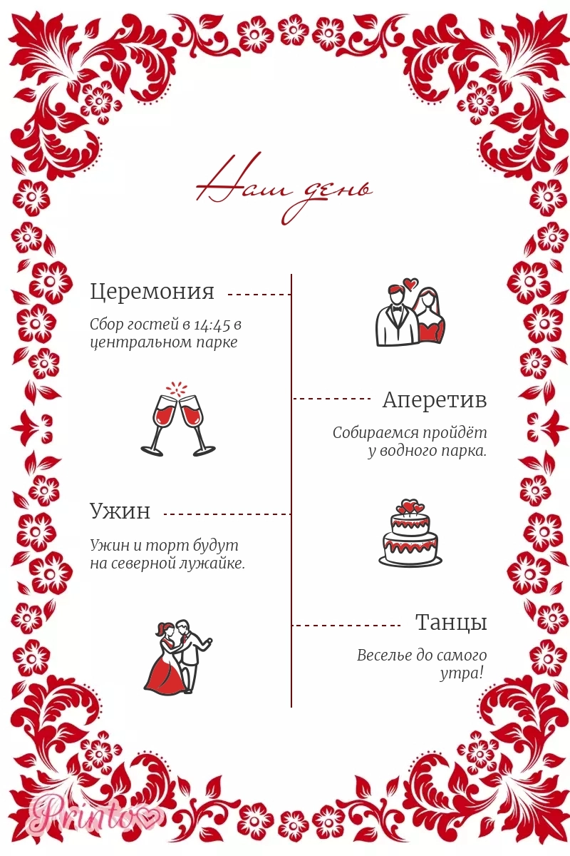 Расскажите гостям о программе свадьбы. Укажите время начала и окончания, а так же основные мероприятия.
