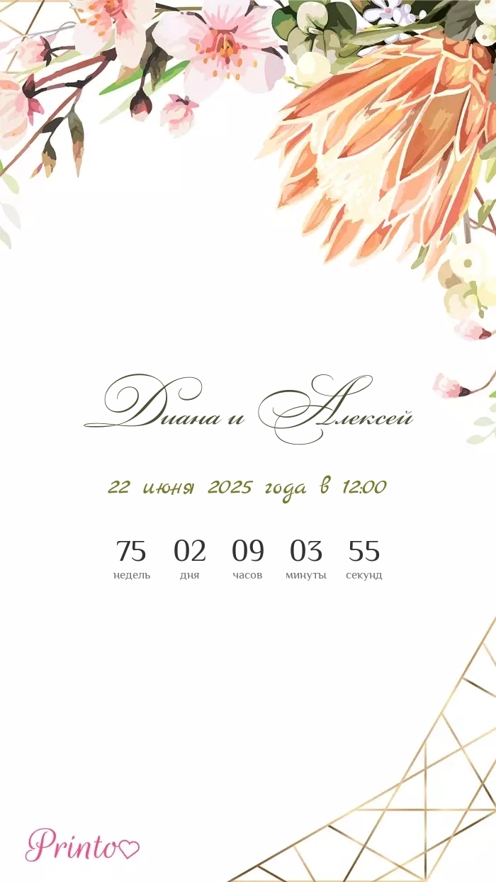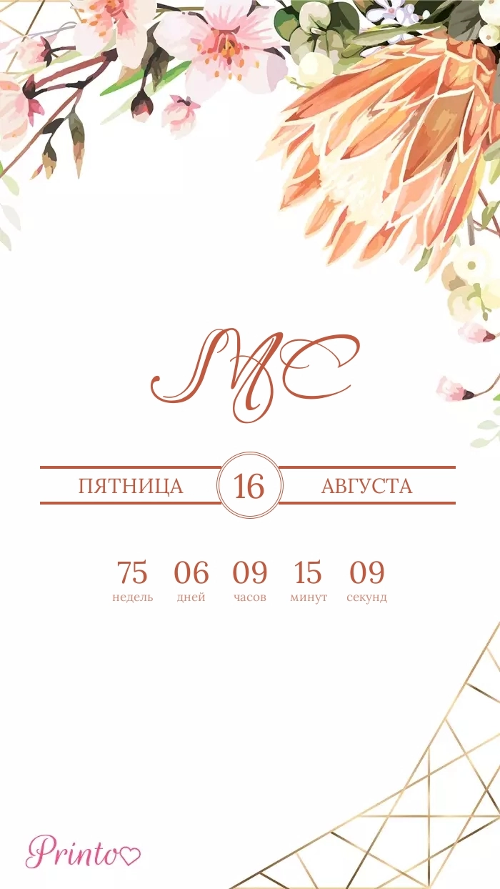 Разместите на нём имена жениха и невесты, дату, а так же обратный отсчёт до свадьбы.