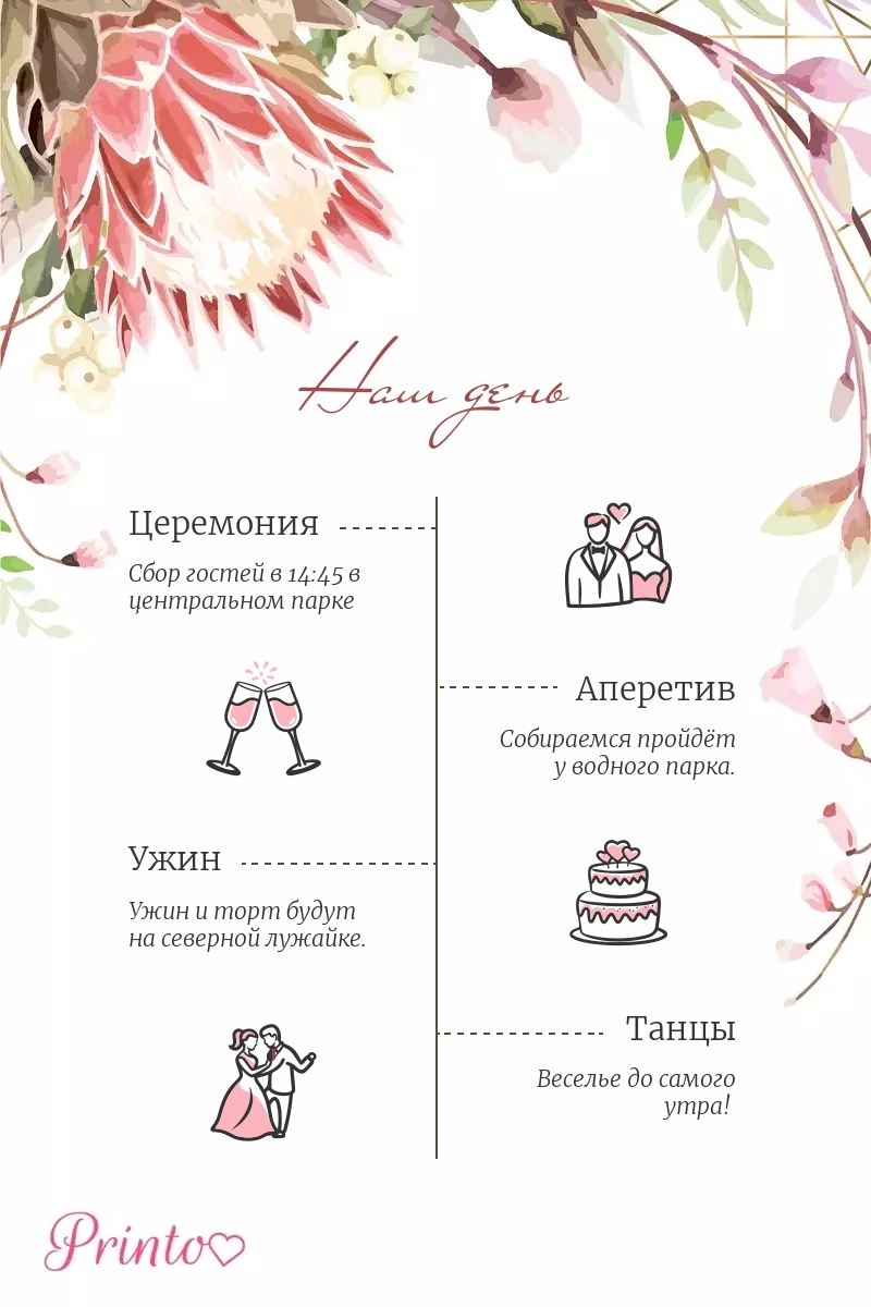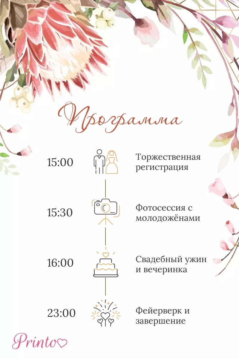 Расскажите гостям о программе свадьбы. Укажите время начала и окончания, а так же основные мероприятия.