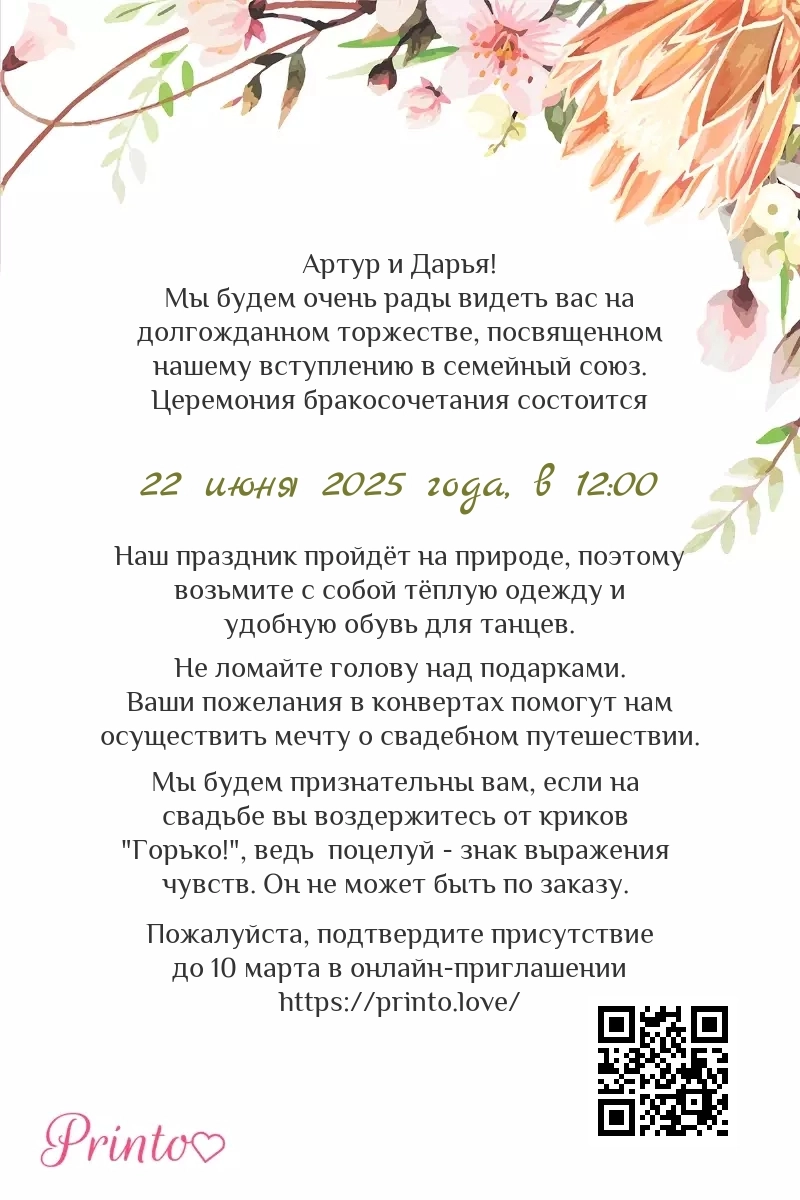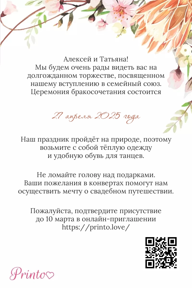 На листе может располагаться персональная ссылка, а так же QR-код на именное цифровое приглашение. Таким образом гости, получившие печатное приглашение, смогут узнать больше о свадьбе и подтвердить присутствие в онлайне.
