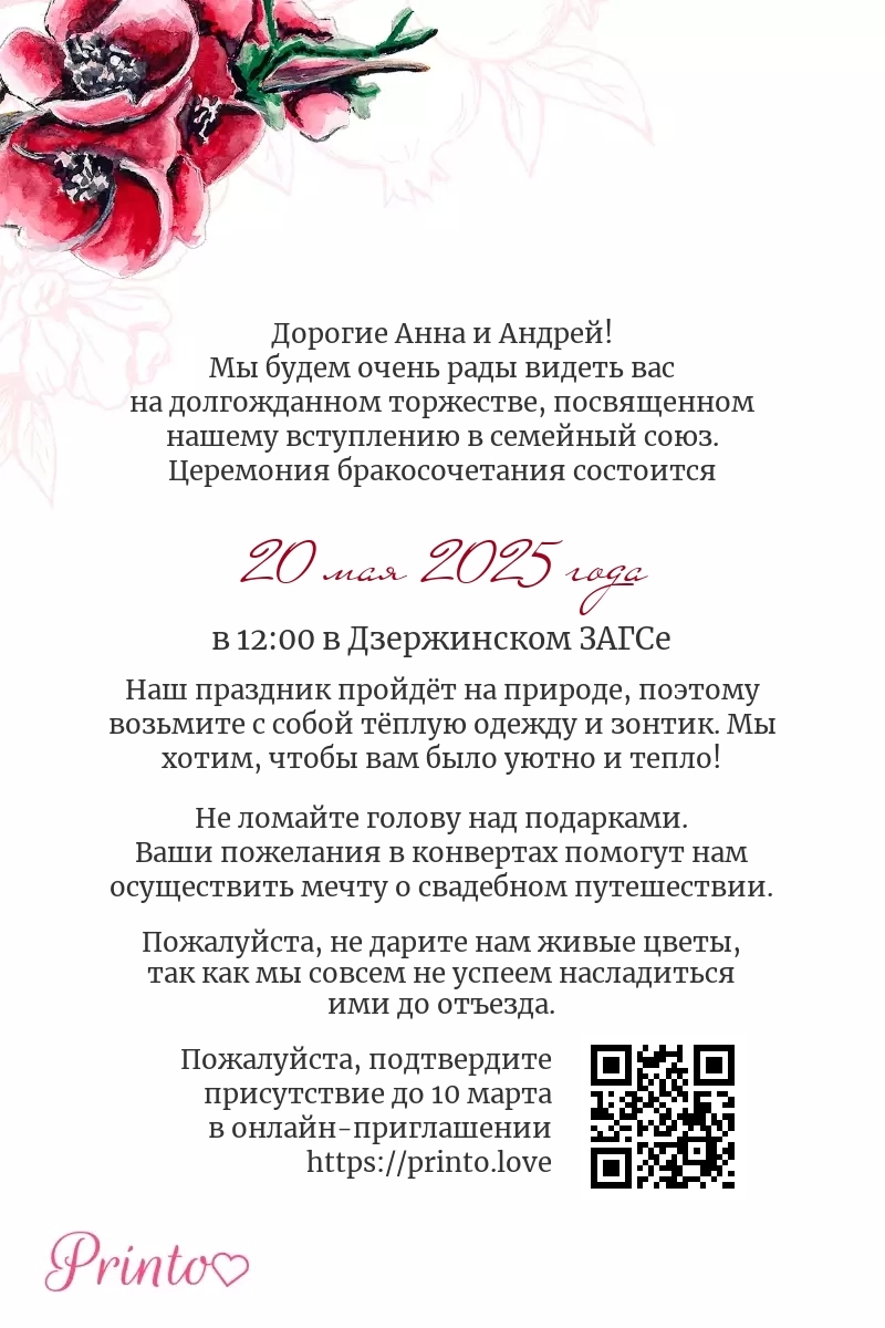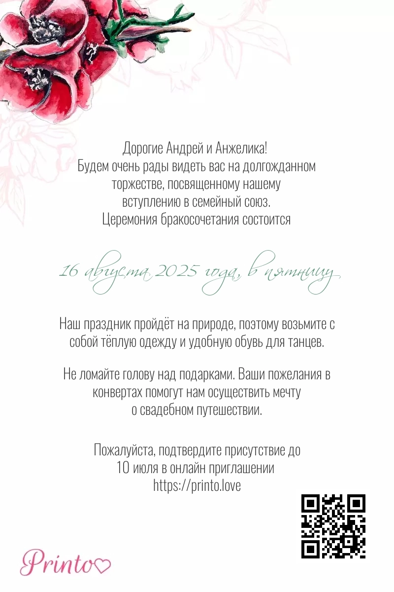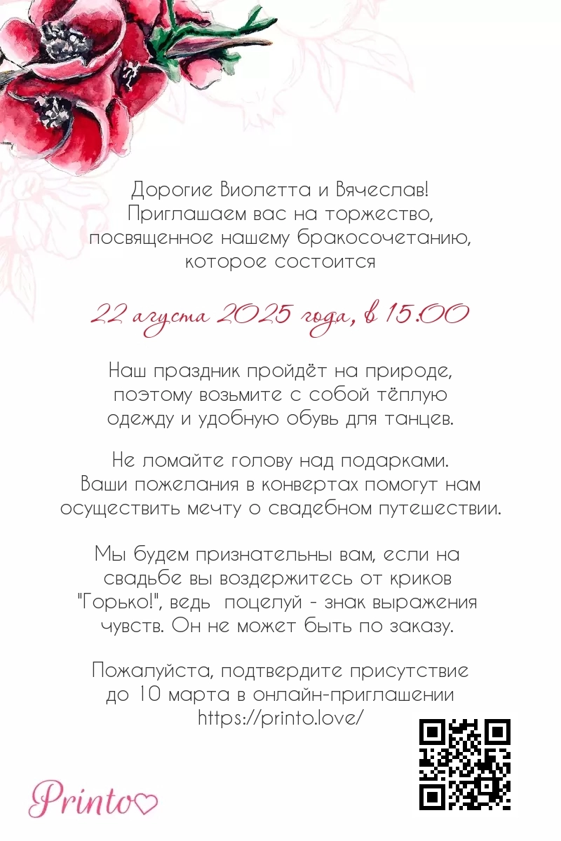 На листе может располагаться персональная ссылка, а так же QR-код на именное цифровое приглашение. Таким образом гости, получившие печатное приглашение, смогут узнать больше о свадьбе и подтвердить присутствие в онлайне.