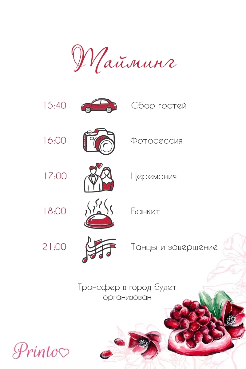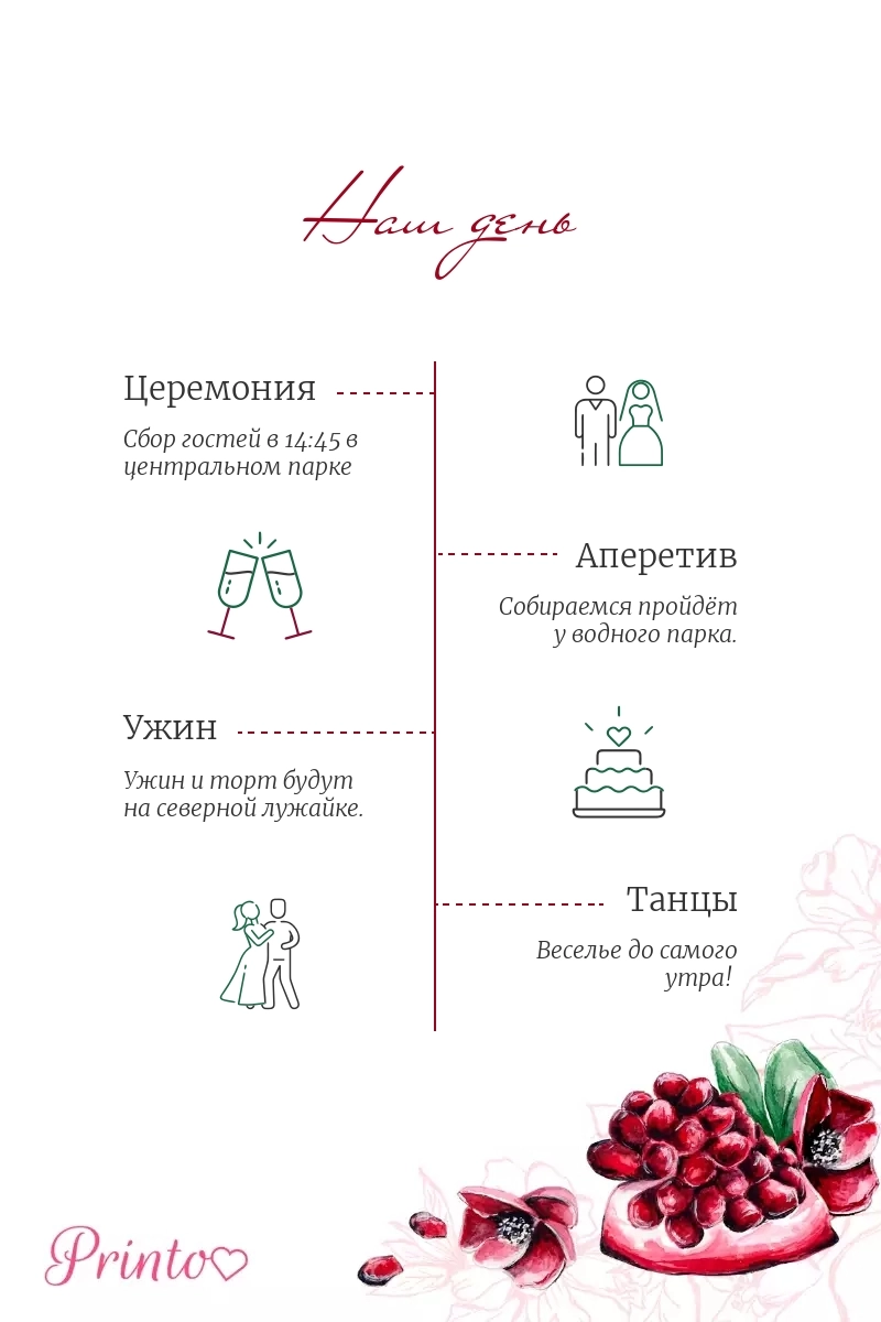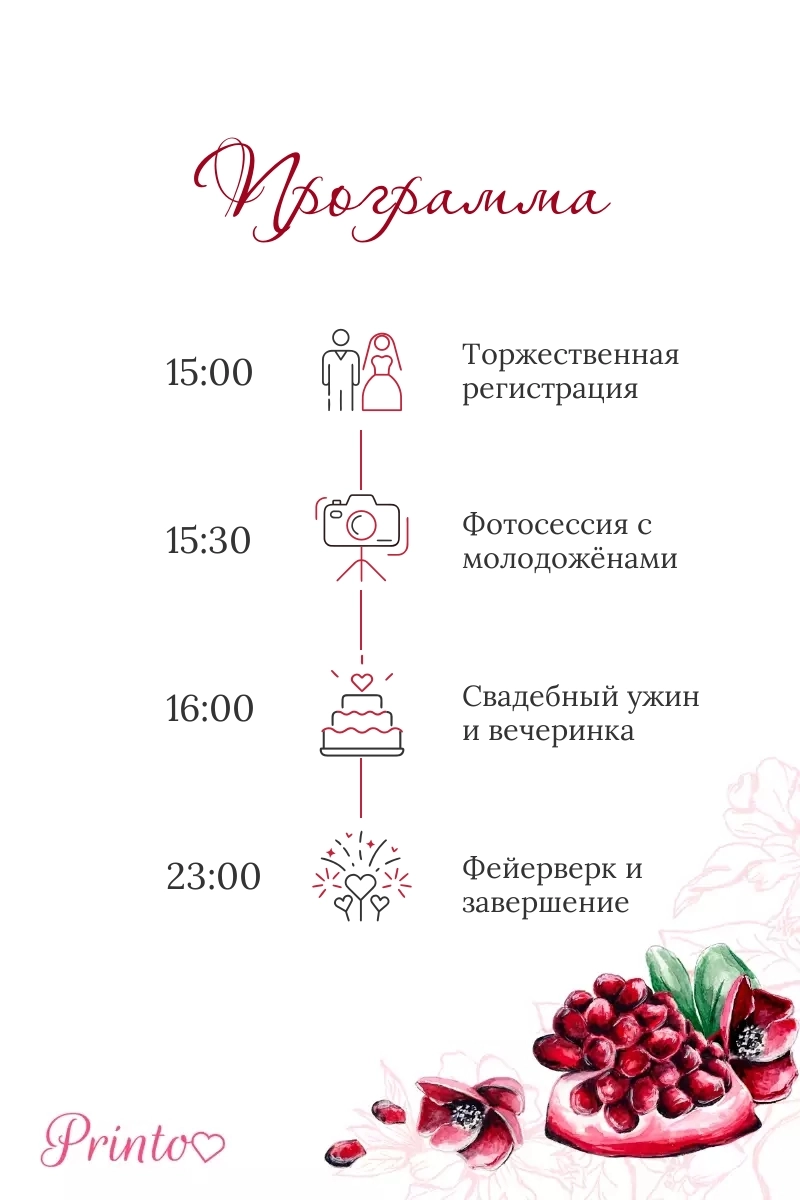 Расскажите гостям о программе свадьбы. Укажите время начала и окончания, а так же основные мероприятия.