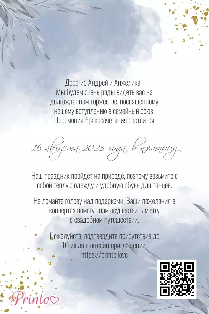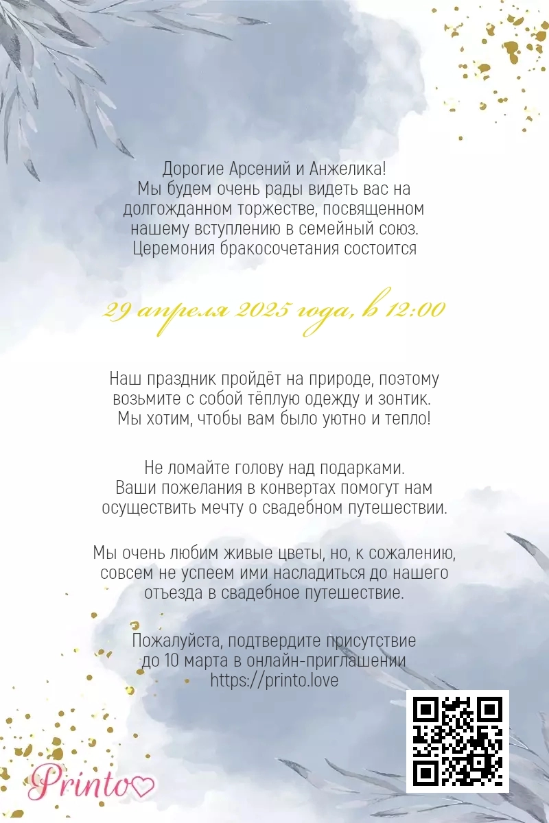 На листе может располагаться персональная ссылка, а так же QR-код на именное цифровое приглашение. Таким образом гости, получившие печатное приглашение, смогут узнать больше о свадьбе и подтвердить присутствие в онлайне.