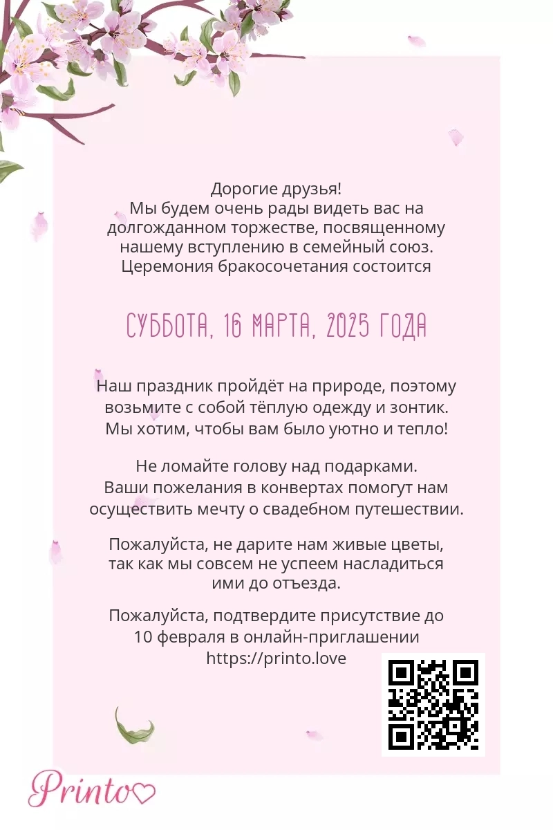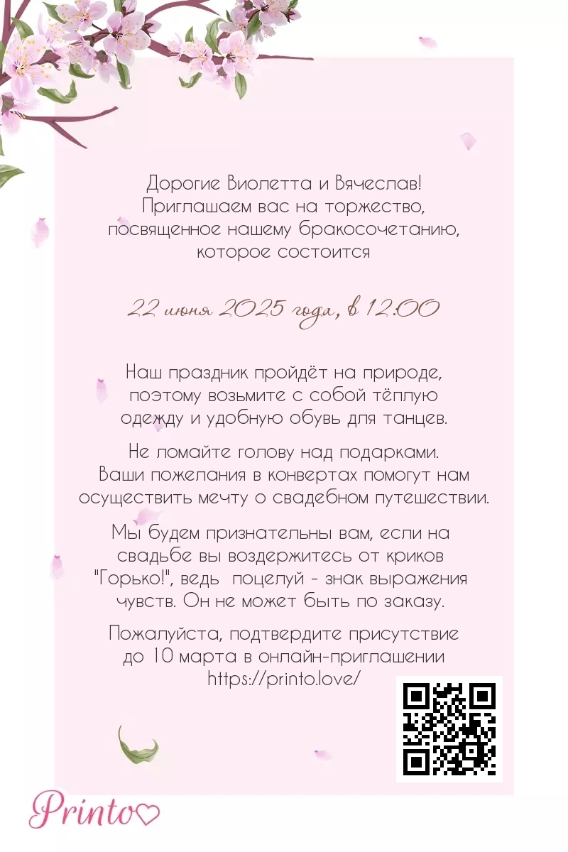 На листе может располагаться персональная ссылка, а так же QR-код на именное цифровое приглашение. Таким образом гости, получившие печатное приглашение, смогут узнать больше о свадьбе и подтвердить присутствие в онлайне.