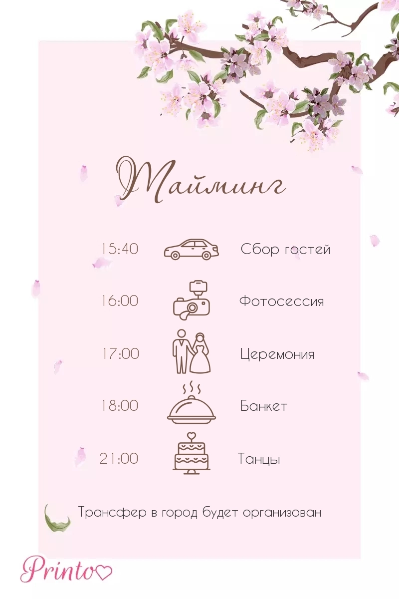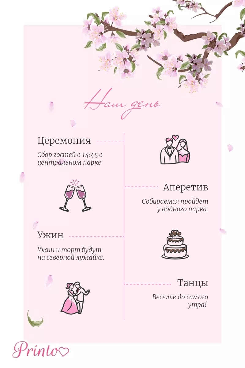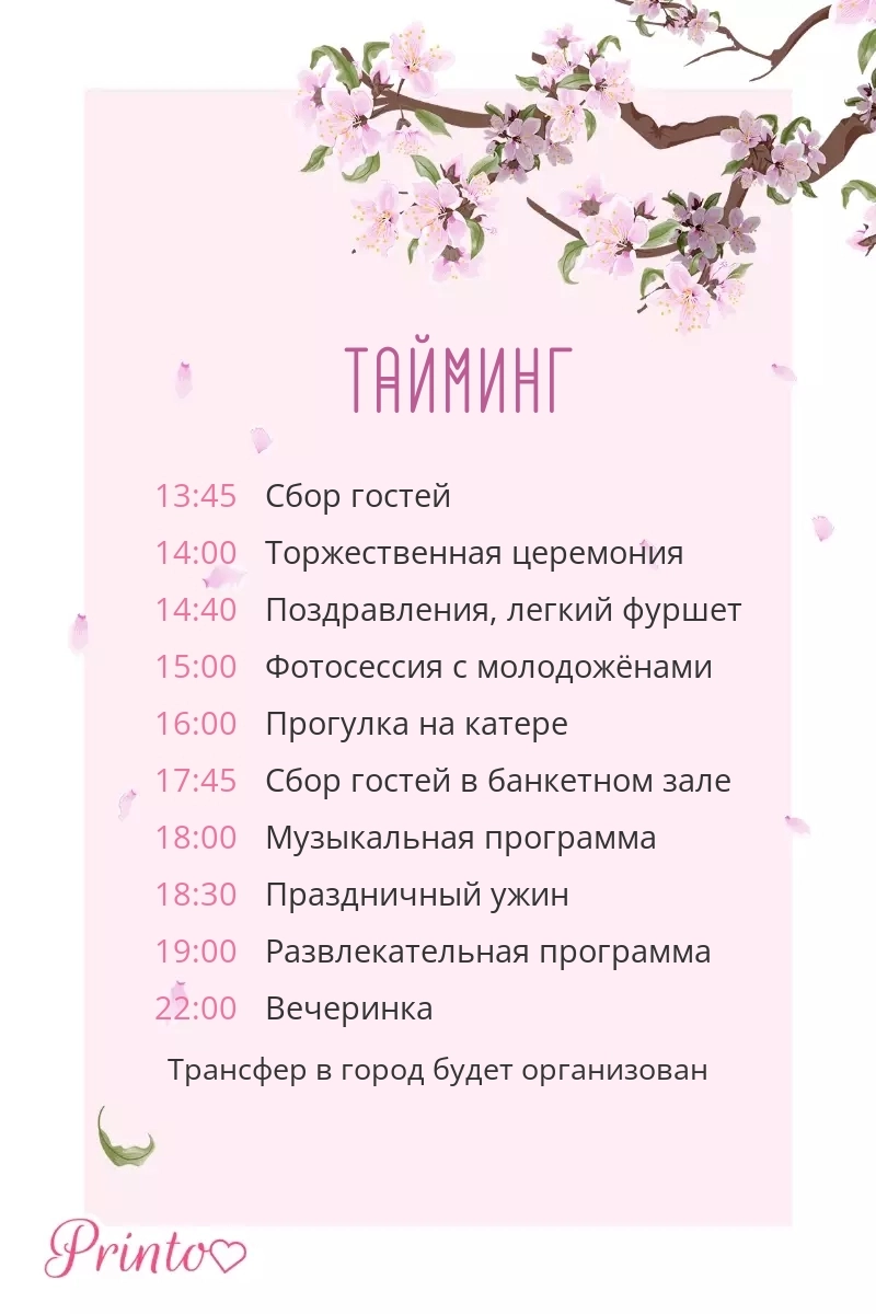 Расскажите гостям о программе свадьбы. Укажите время начала и окончания, а так же основные мероприятия.