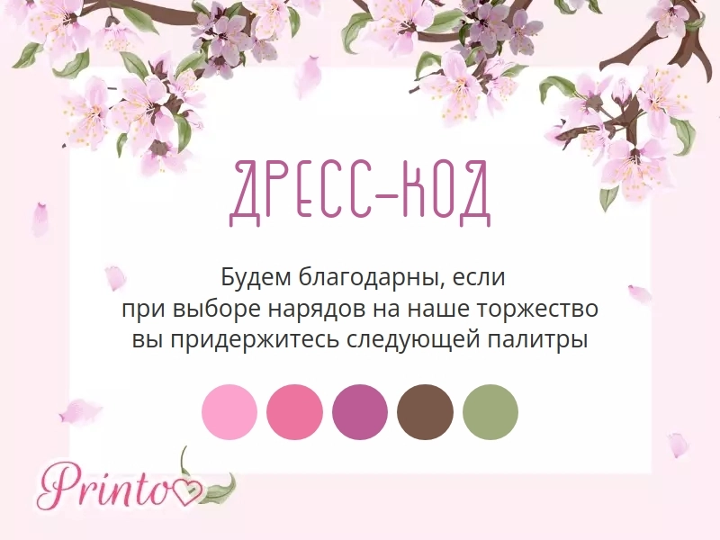 Укажите, какой дресс-код предпочтителен на вашей свадьбе. Вставьте на слайд палитру цветов, которые будут преобладать на свадьбе.