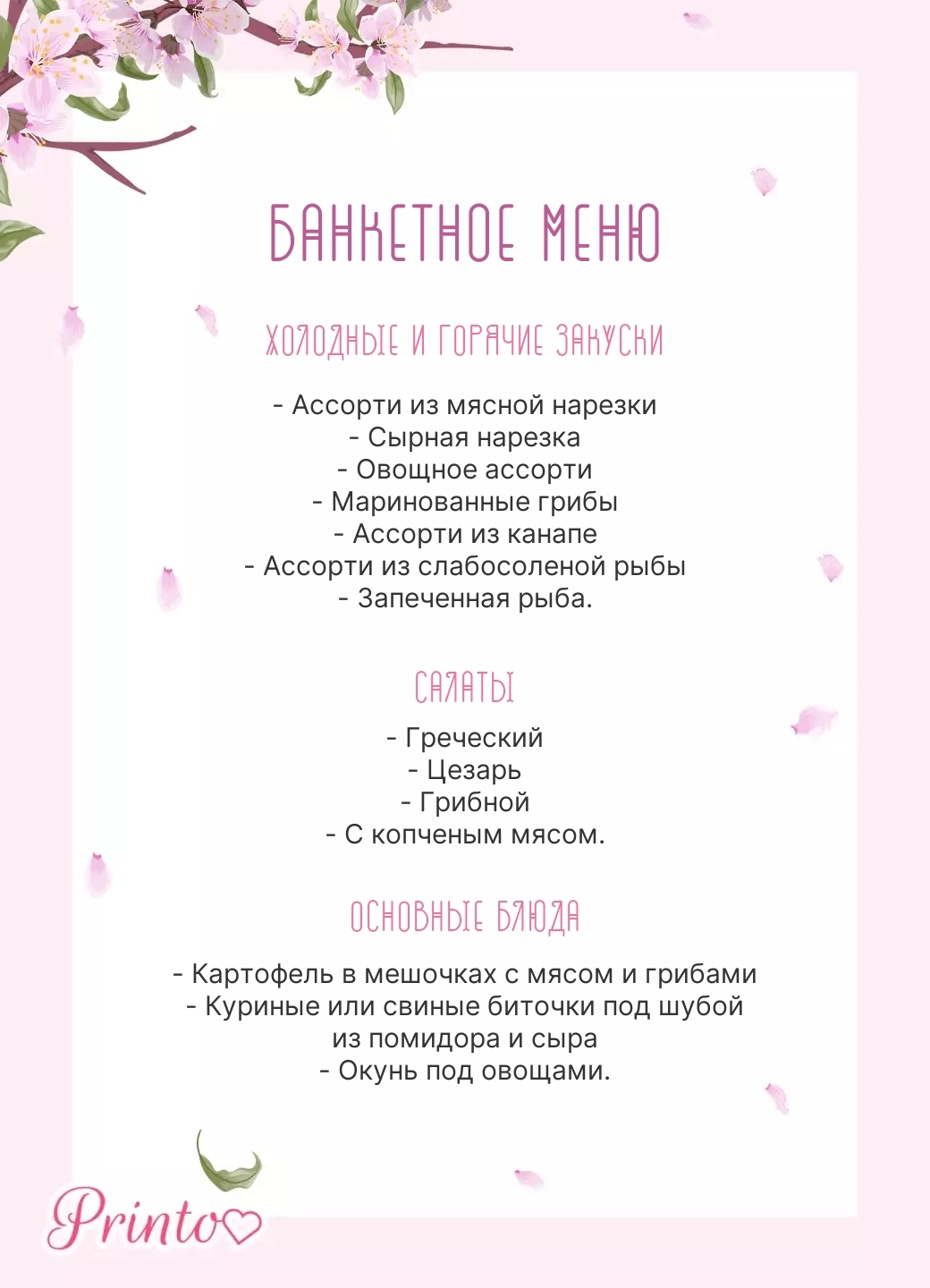 На листе меню обычно указывают блюда, которые будут поданы на свадьбе, а так же напитки и десерты.