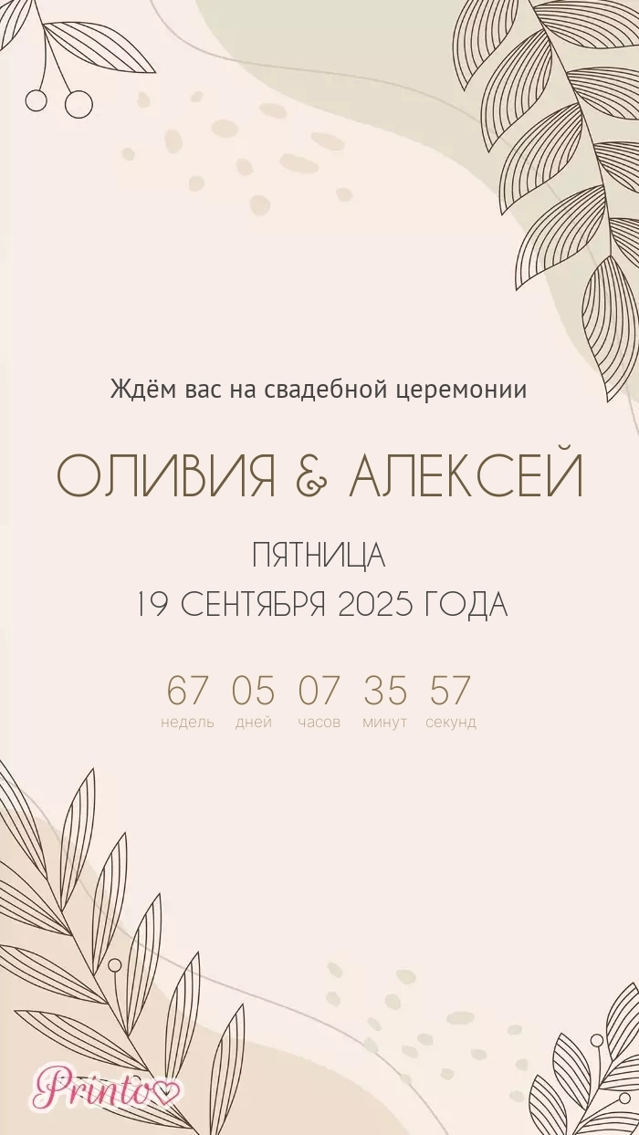 Разместите на нём имена жениха и невесты, дату, а так же обратный отсчёт до свадьбы.