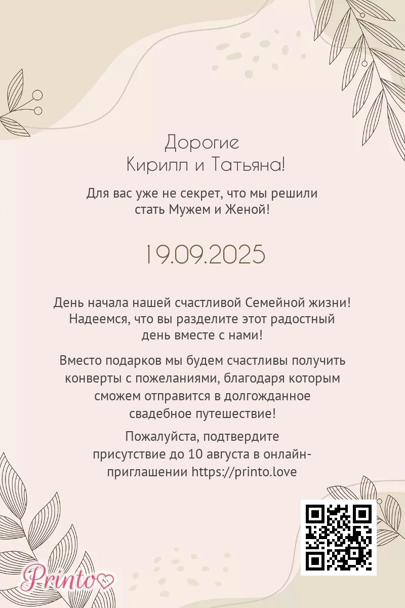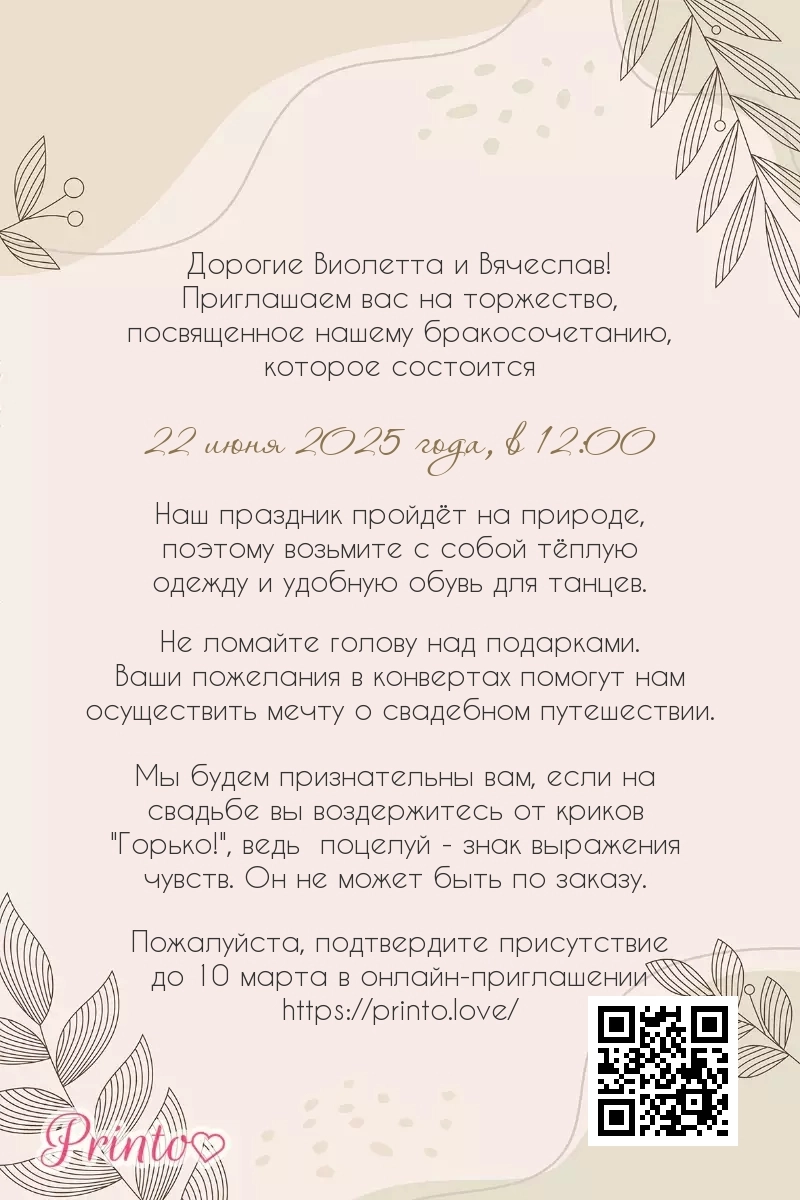 На листе может располагаться персональная ссылка, а так же QR-код на именное цифровое приглашение. Таким образом гости, получившие печатное приглашение, смогут узнать больше о свадьбе и подтвердить присутствие в онлайне.