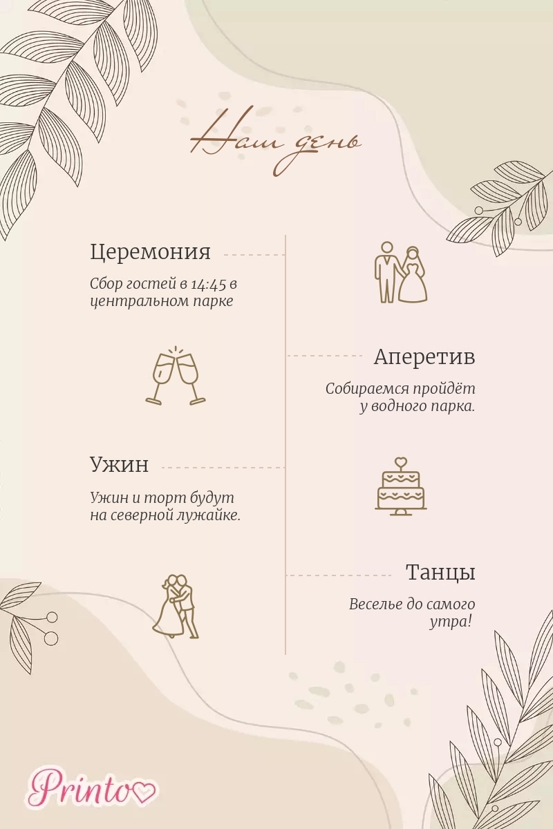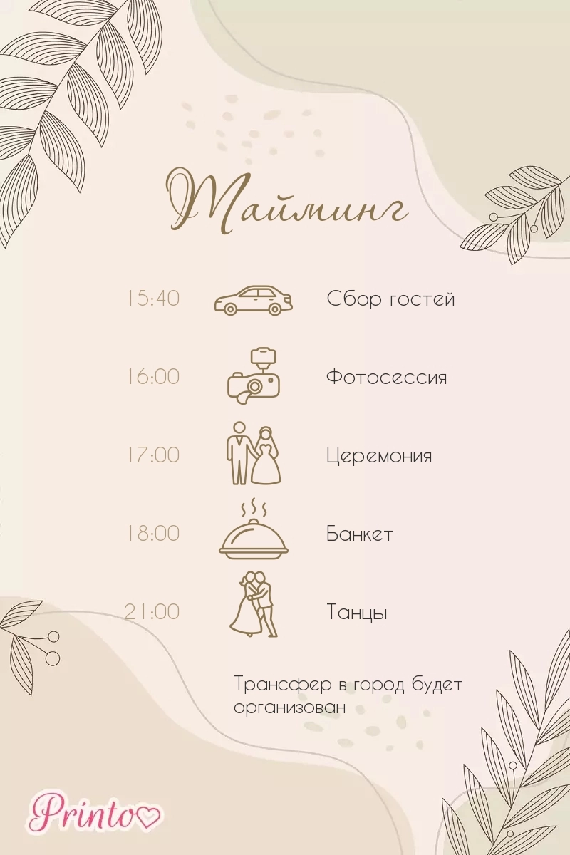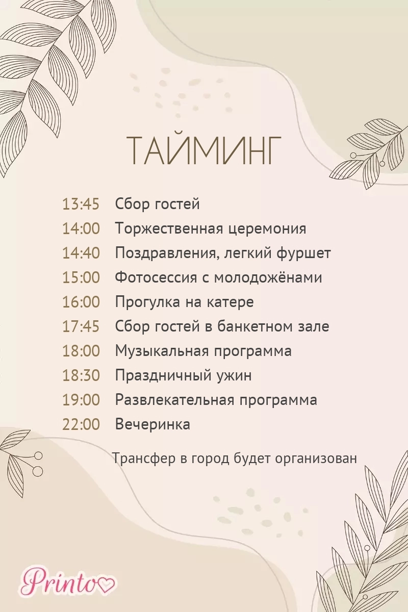 Расскажите гостям о программе свадьбы. Укажите время начала и окончания, а так же основные мероприятия.