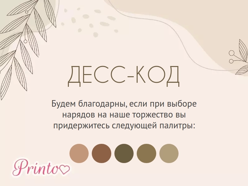 Укажите, какой дресс-код предпочтителен на вашей свадьбе. Вставьте на слайд палитру цветов, которые будут преобладать на свадьбе.