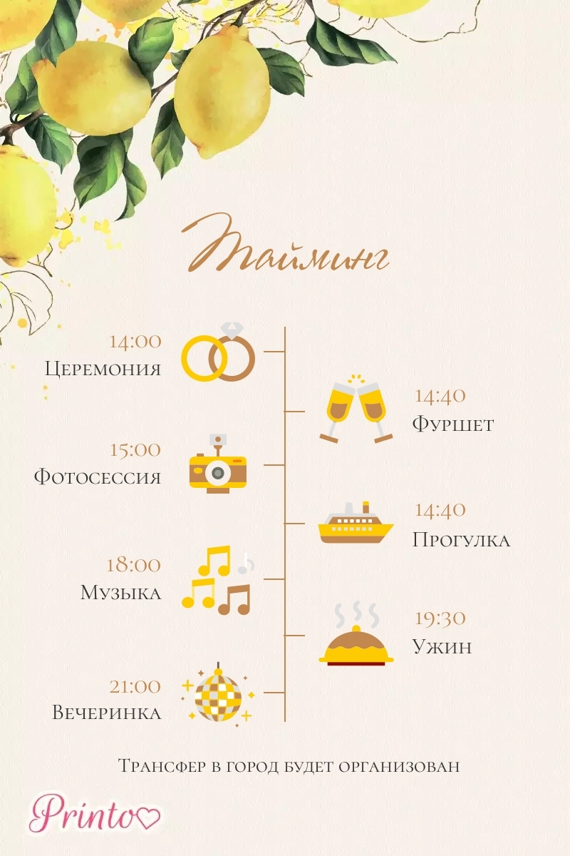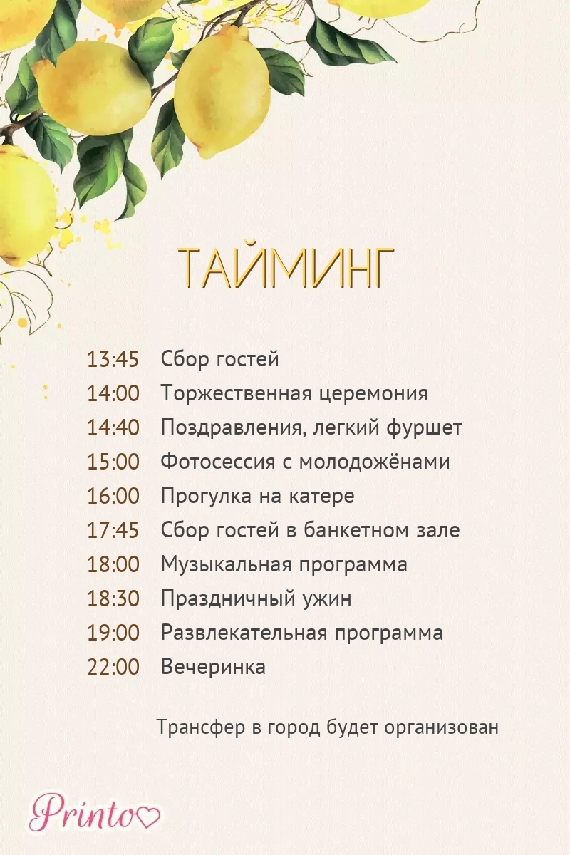 Расскажите гостям о программе свадьбы. Укажите время начала и окончания, а так же основные мероприятия.