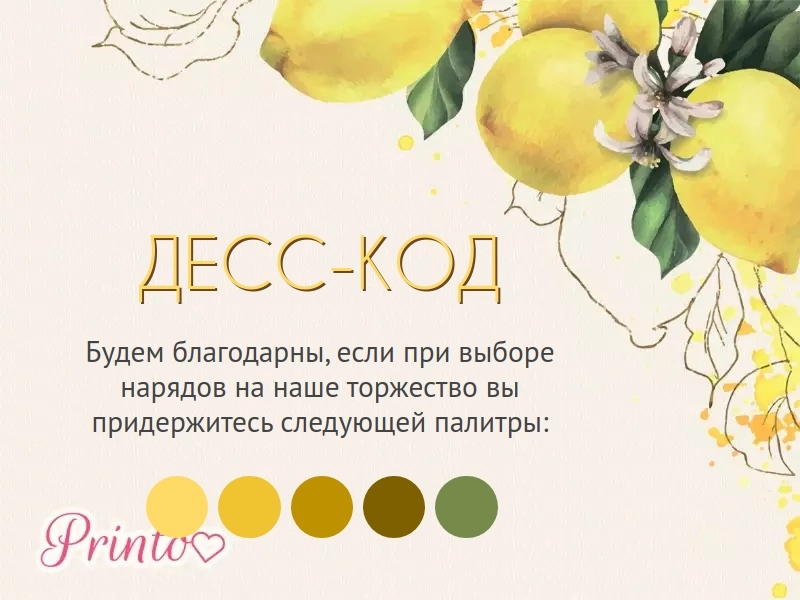 Укажите, какой дресс-код предпочтителен на вашей свадьбе. Вставьте на слайд палитру цветов, которые будут преобладать на свадьбе.