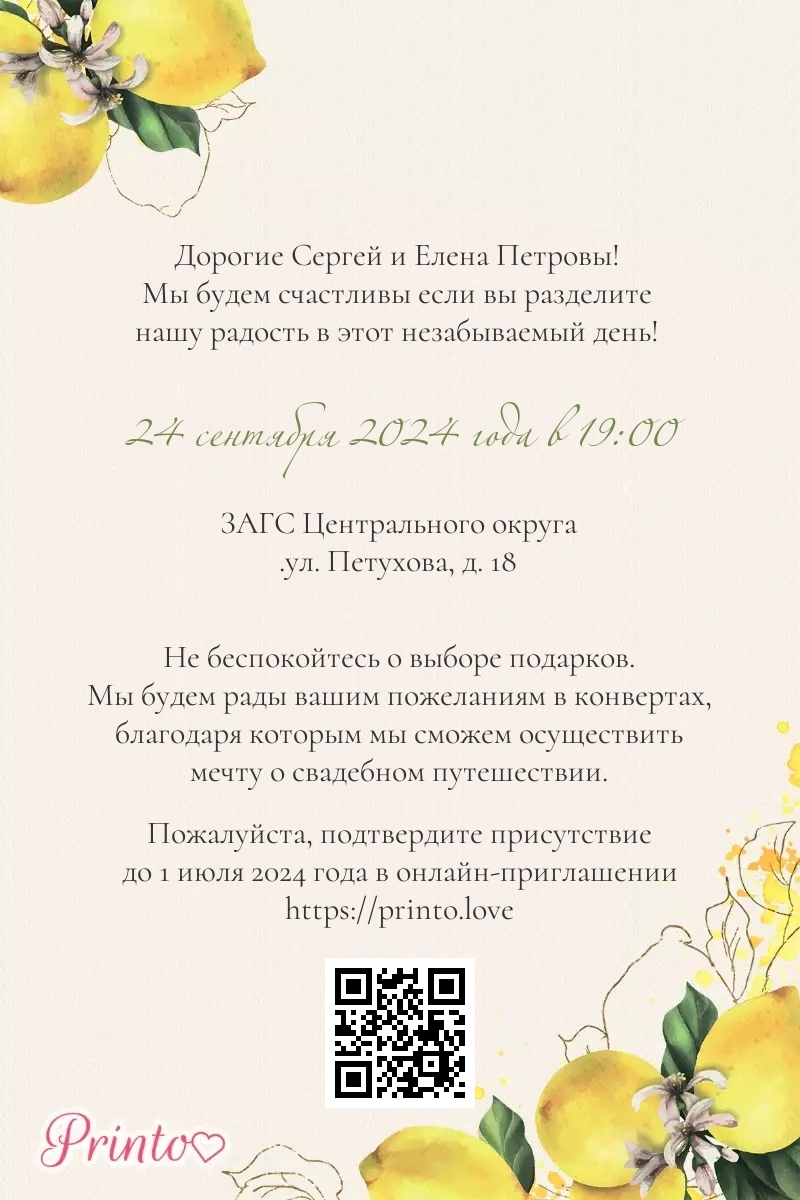На листе может располагаться персональная ссылка, а так же QR-код на именное цифровое приглашение. Таким образом гости, получившие печатное приглашение, смогут узнать больше о свадьбе и подтвердить присутствие в онлайне.