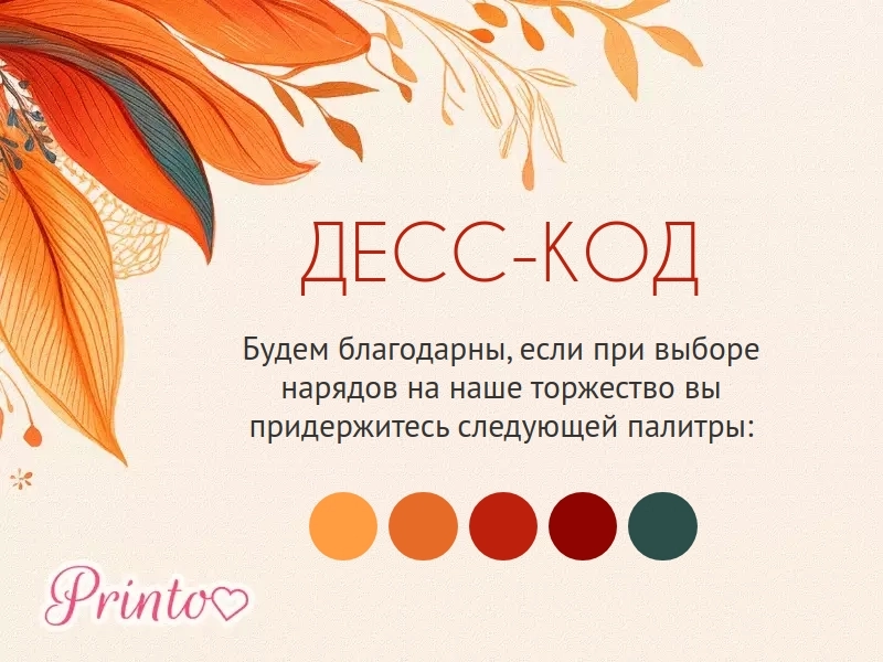 Укажите, какой дресс-код предпочтителен на вашей свадьбе. Вставьте на слайд палитру цветов, которые будут преобладать на свадьбе.