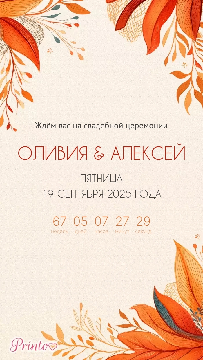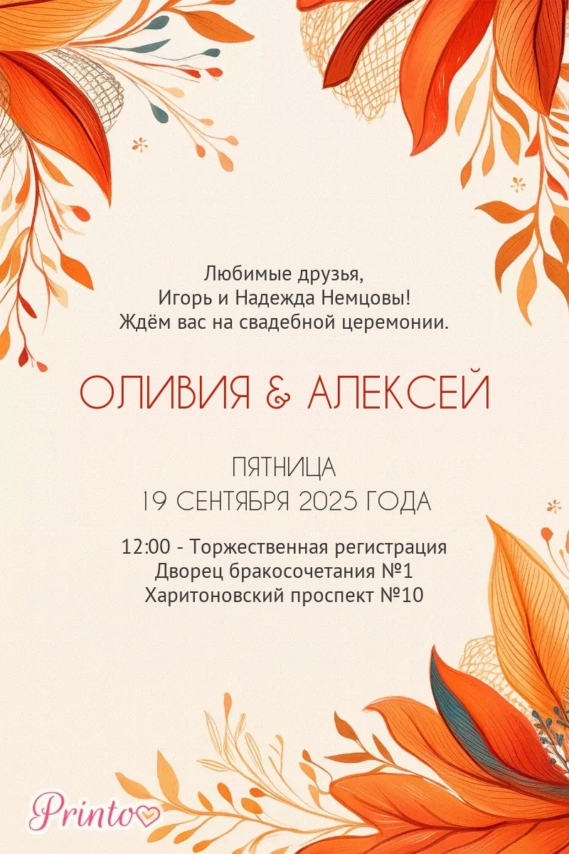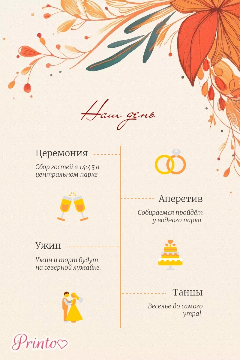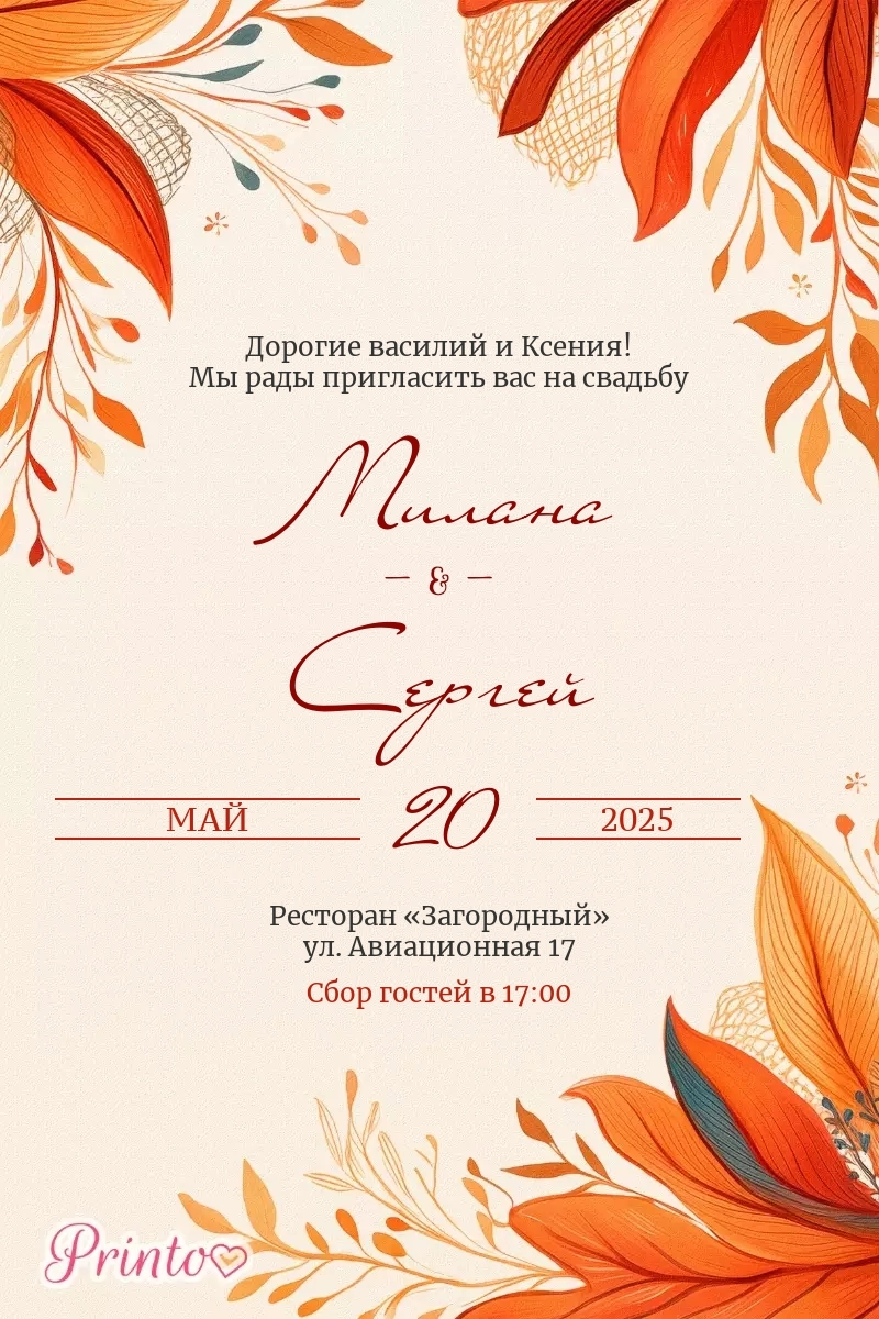 Приглашение идеально подойдет для пары, стремящейся подчеркнуть свою любовь к природе и ярким краскам. Оно отлично передает атмосферу радости и счастья, обещая гостям незабываемое и красочное торжество.