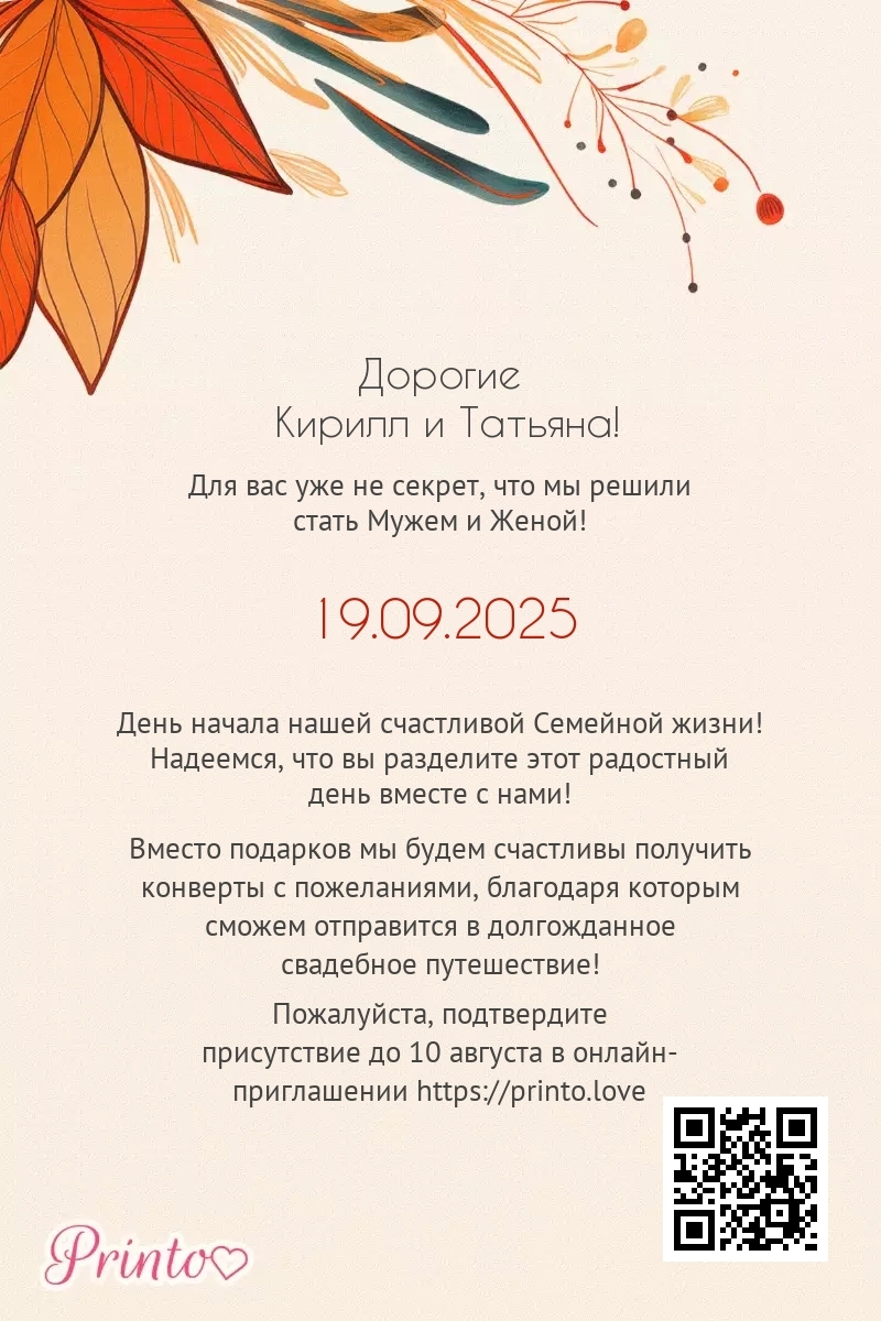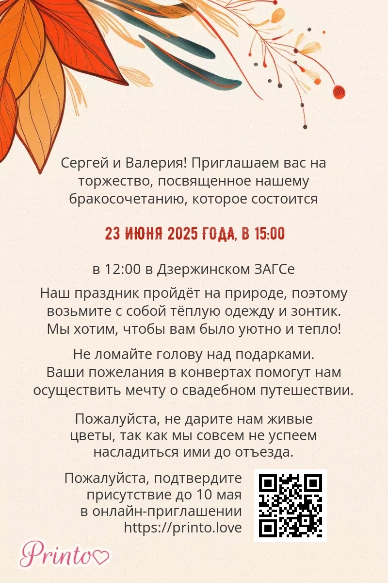 На листе может располагаться персональная ссылка, а так же QR-код на именное цифровое приглашение. Таким образом гости, получившие печатное приглашение, смогут узнать больше о свадьбе и подтвердить присутствие в онлайне.